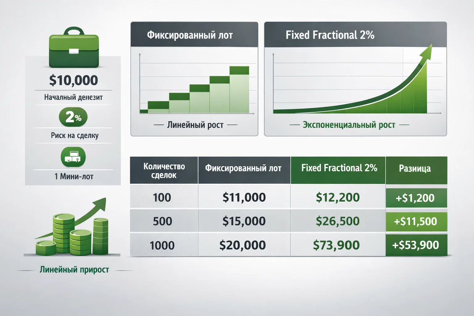 Преимущества этого метода очевидны: простота расчётов, предсказуемость результатов, лёгкость анализа статистики торговли. Однако есть существенные недостатки. Рост капитала будет линейным, а не экспоненциальным — вы не используете эффект сложного процента. Кроме того, относительный риск меняется: если ваш счёт вырос с 10 000 до 20 000 долларов, а вы всё ещё торгуете тем же объёмом, то риск на сделку в процентном выражении уменьшился вдвое. Звучит хорошо, но это означает, что вы используете капитал неэффективно.