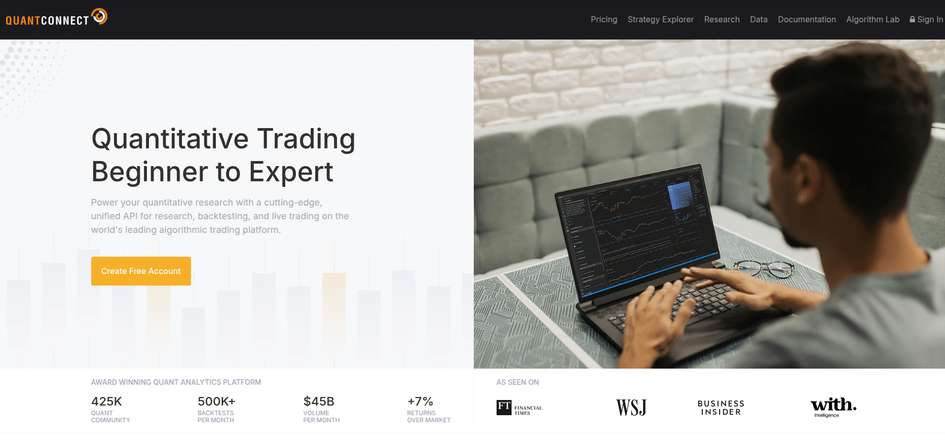 Облачная платформа для алгоритмической торговли с возможностями машинного обучения. Поддерживает Python и C#, предоставляет исторические данные бесплатно.