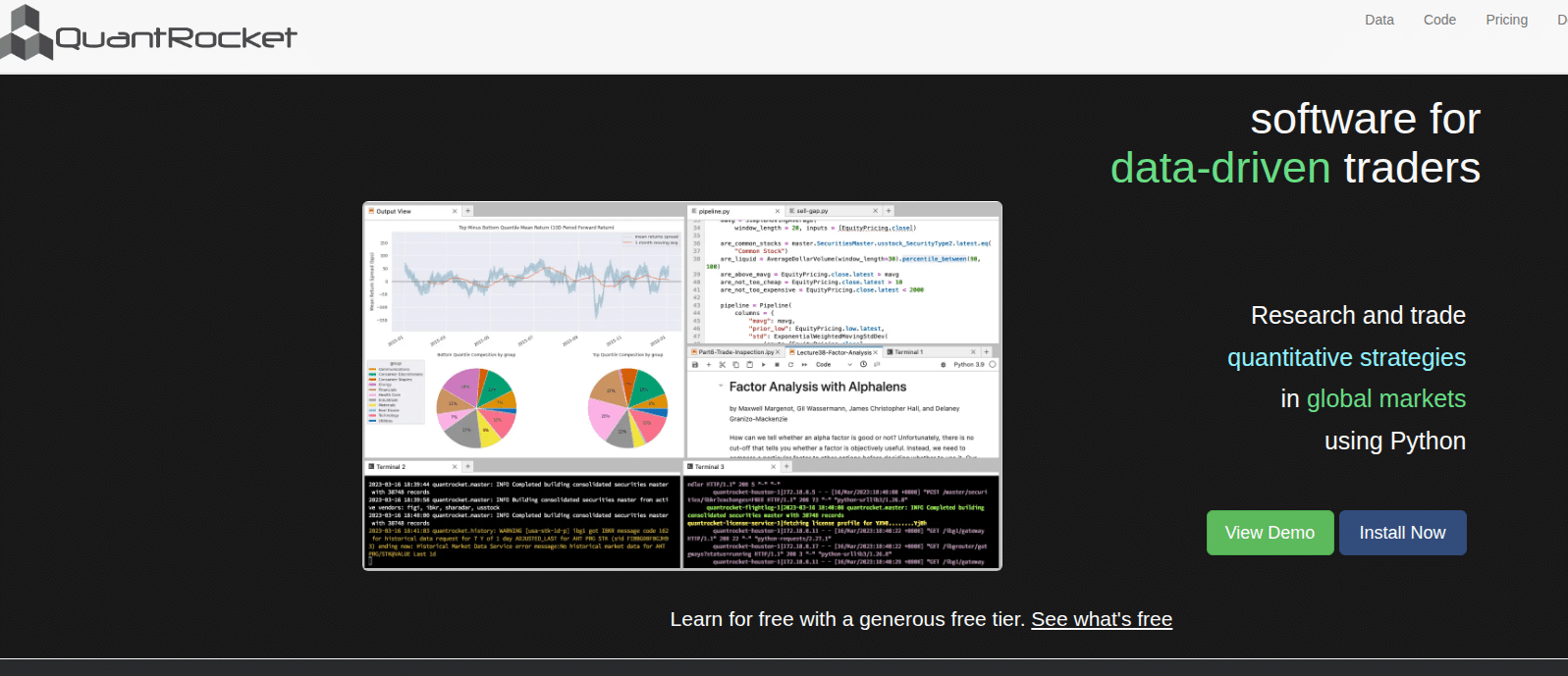 • QuantRocket — полнофункциональная Python-платформа для квант-трейдинга, поддерживает ML через scikit-learn, Keras/TensorFlow и XGBoost, работает с альтернативными данными. Стоимость от $19.99/месяц (зависит от типа лицензии).