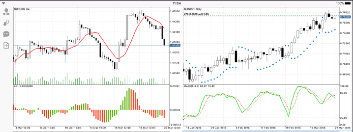 - Наличие инструментов анализа. Мобильная платформа предлагает использовать весь набор распространённых индикаторов, примерно таких же, какие входят в базовую версию Метатрейдера. То есть доступны мувинги, осцилляторы, уровни фибоначчи и так далее, то есть необходимый минимум для мобильного трейдинга онлайн. Всё это даёт возможность оценить обстановку и посмотреть данные индикаторов, пусть и в ограниченном виде. Например, MACD, одинаково информативен что в терминале на компьютере, что в мобильном.