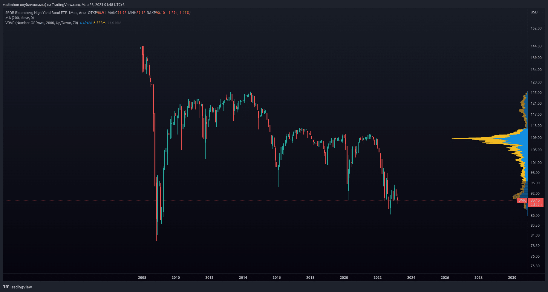 - SPDR Bloomberg Barclays High Yield Bond ETF (JNK) — Фонд имеет большую долю бросовых бумаг в своем портфеле по сравнению с другими ETF.
