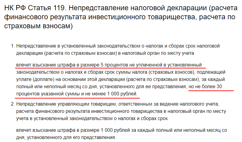 - если нарушен срок подачи декларации, то за каждый полный/неполный месяц просрочки взимается штраф в размере 5% от НДФЛ. Всего за счет взысканий этого типа трейдер может лишиться до 30% от НДФЛ (минимум 1000 руб.). То есть при нарушении срока подачи декларации трейдеру придется заплатить не только сам НДФЛ, но еще и штраф до 30% от его размера;