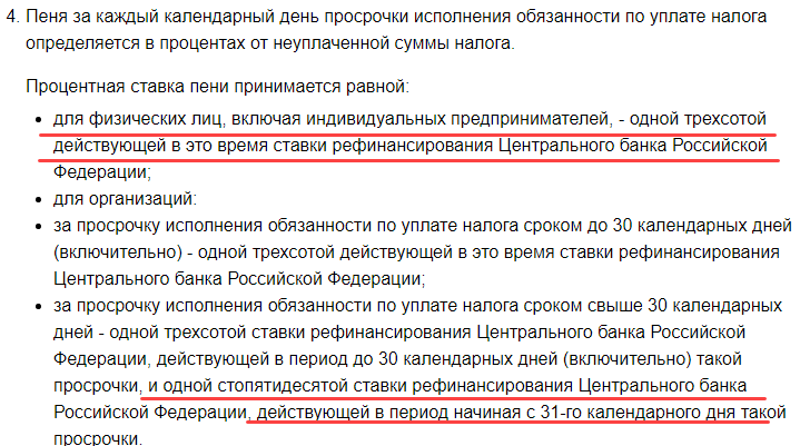 - ст. 75 НК РФ предусматривает небольшую пеню, начисляемую ежедневно при нарушении сроков подачи декларации. Пеня плавающая. а ее размер привязывается к ставке ЦБ РФ, ее размер рассчитывается как ставка центробанка/300 и начисляется каждый день. Для юрлиц с 31-го дня просрочки пеня растет вдвое;