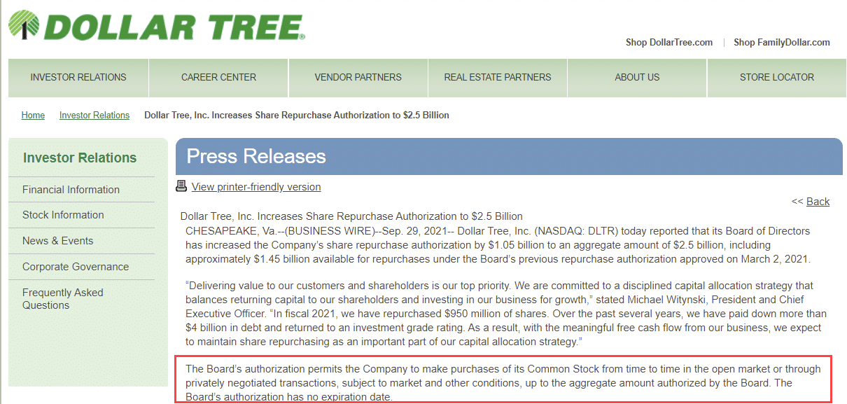 Например, руководство Dollar Tree, Inc. расширило программу выкупа ценных бумаг. Также сообщается, что операции будут проводиться на открытом рынке, но не исключены сделки, заключенные в частном порядке, например, с крупными акционерами. Это пример гибридной модели.