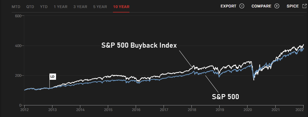 Этот индекс полезен для отбора бизнеса с большим потенциалом роста. Стабильный выкуп собственных бумаг в прошлом не гарантирует, что то же будет происходить в будущем, но вероятность этого все же высока. Поэтому в теории S&P 500 Buyback Index должен обгонять широкий рынок с точки зрения доходности.