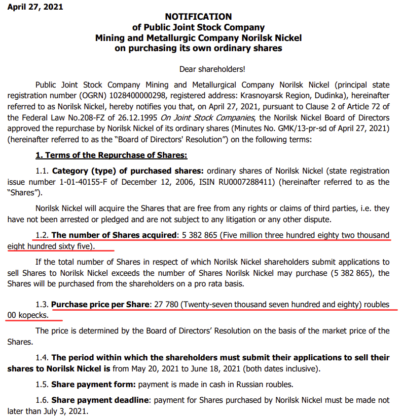 Пример программы выкупа такого типа – байбэк от Норникеля. Весной 2021 г. Норникель объявил о намерении выкупить более 5 млн собственных ценных бумаг. Также в проспекте указывалась фиксированная цена, весь объем покупался по этой стоимости.