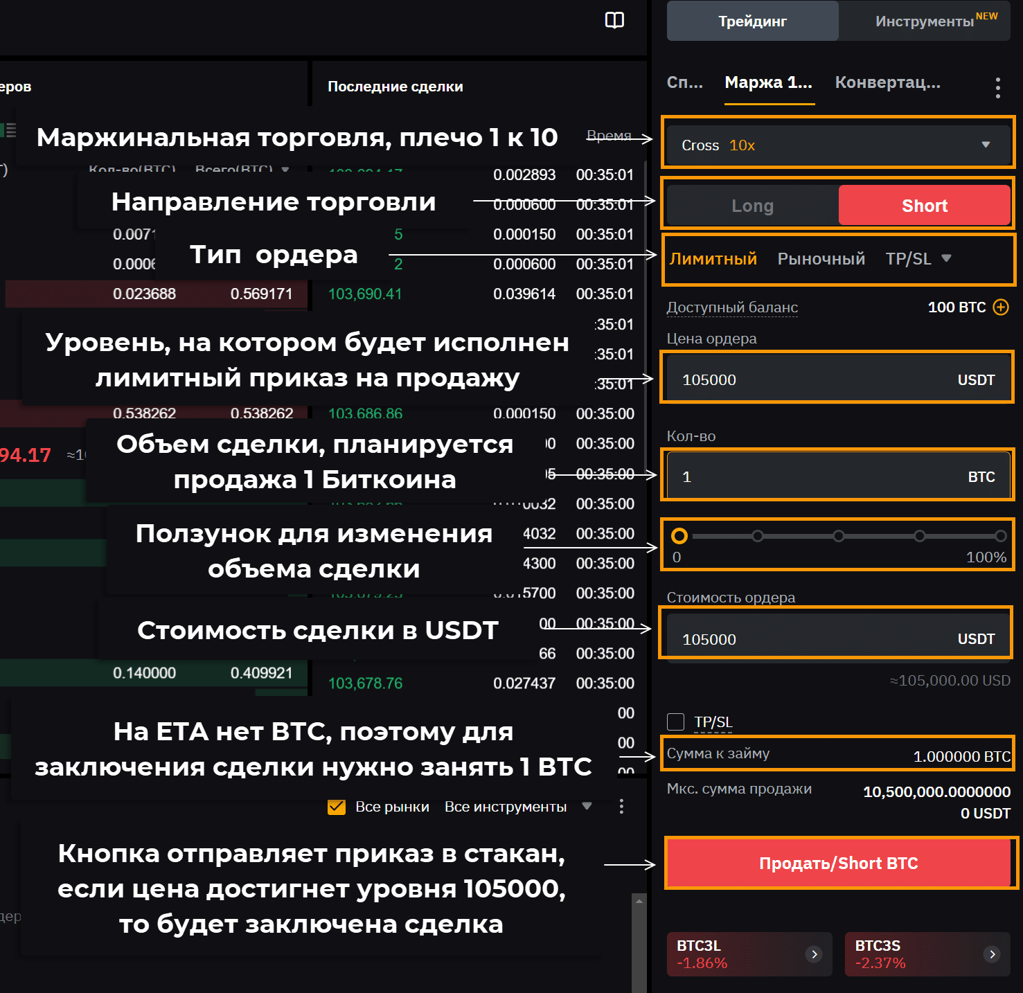 - На аккаунте трейдера 10000 USDT. Он планирует работать с BTCUSDT (рыночный курс 100000 USDT за 1 Биткоин) с плечом 1 к 10.