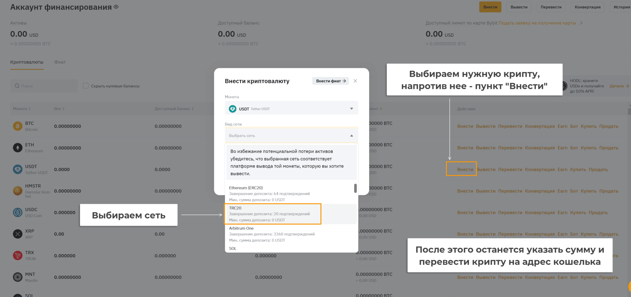 При пополнении и выводе вы будете иметь дело с аккаунтом финансирования. Для пополнения нужно выбрать соответствующую крипту в аккаунте финансирования, затем: