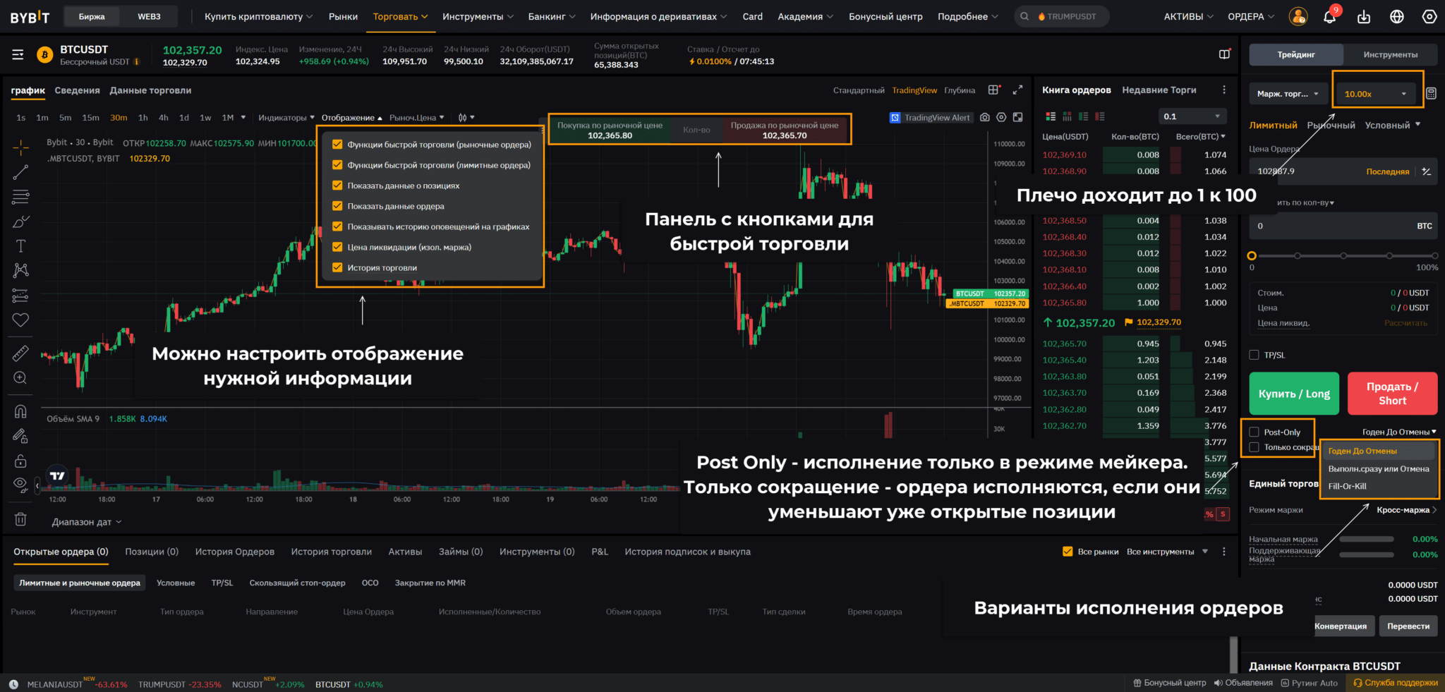 - Ордера могут работать в режиме Post Only и Только сокращение. Post Only означает, что ордер будет выполнен только если его можно исполнить как приказ мейкера, а не тейкера. Только сокращение позволяет исполнять только те приказы, которые приводят к уменьшению размера позиции. Используется при закрытии позиций в режиме хеджирования.