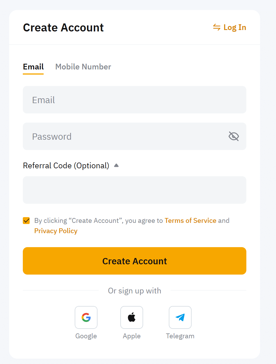 Регистрация прошла быстро и без сюрпризов. Указываешь email, придумываешь пароль, подтверждаешь почту — вот и всё. Минимализм в духе Binance, никакой лишней информации на старте.