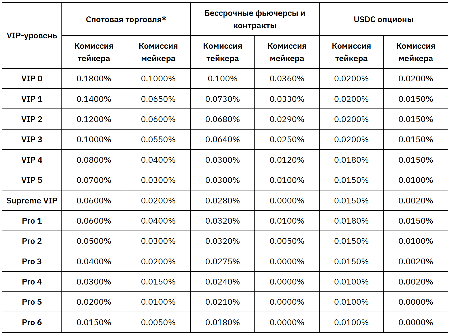 Комиссии стартуют от 0.1% на споте и 0.06% на фьючерсах. По мере роста торговых объемов ставки постепенно снижаются. Если на споте выйти в мейкеры, то со второй ступени можно торговать вообще без комиссий.