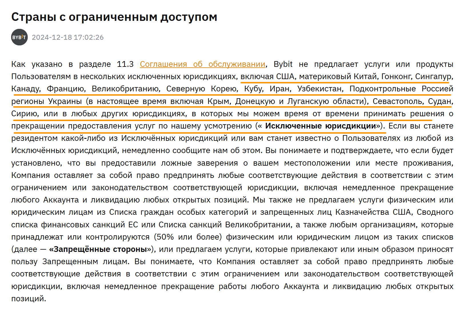 Биржа не предоставляет услуги резидентам ряда стран. В их число входят США, Куба, подконтрольные России украинские регионы, включая Крым, Судан, Франция, Великобритания. Эти ограничения обусловлены либо особенностями местного законодательства, либо санкциями, геополитикой и неопределенным статусом регионов.