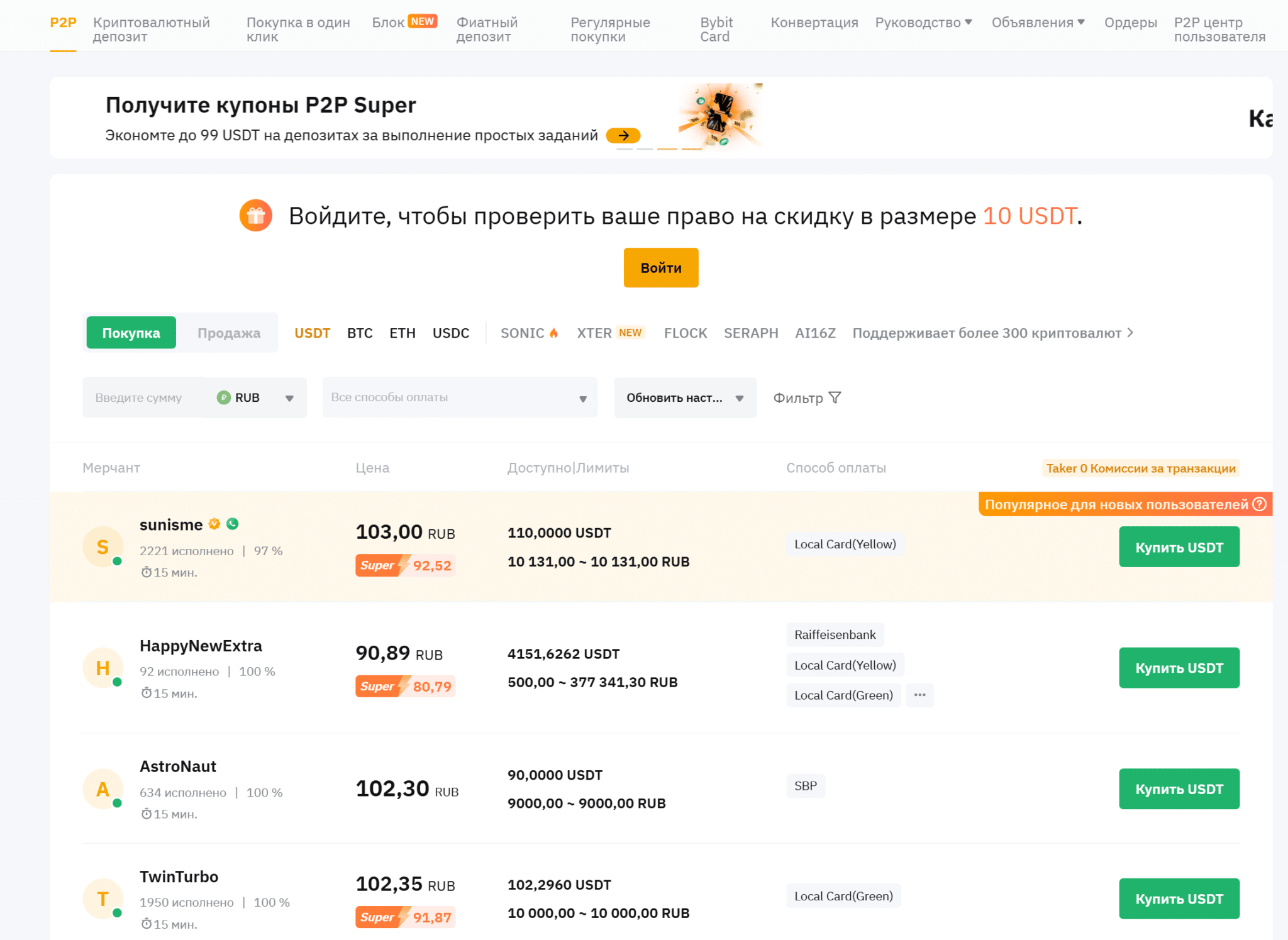 P2P рынок идеальное решение для быстрой покупки и продажи крипты. В этой секции масса продавцов и поддерживаются все популярные методы оплаты – от рублевых банковских карт до кошельков платежных систем. Ссылка на p2p раздел находится в разделе «Купить криптовалюту» -> «Покупка в один клик».