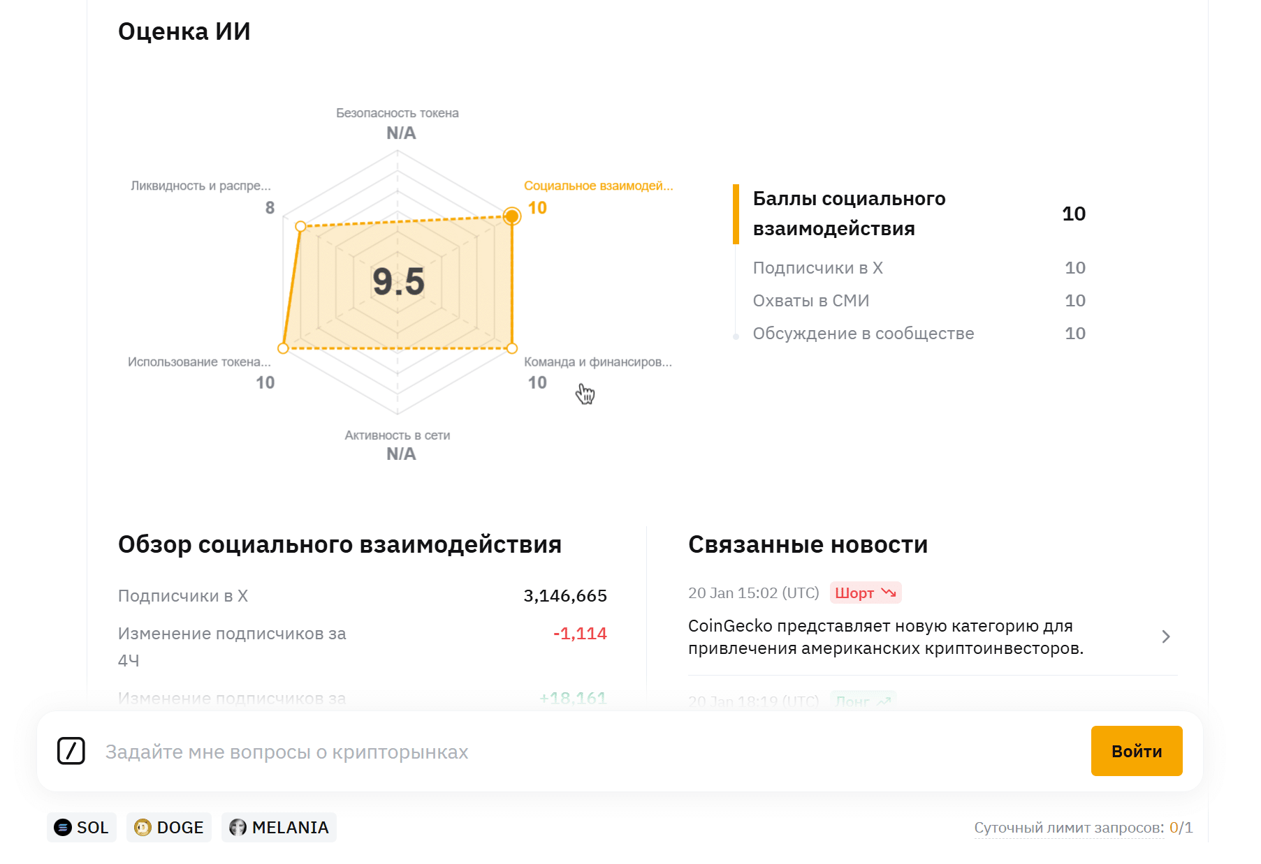 - TradeGPT. Бот построен на языковой модели ChatGPT 3.5 и дает оценку криптовалют с точки зрения ликвидности, безопасности, социального взаимодействия, команды и финансирования, активности в сети, использования токена. Криптобиржа Байбит не участвует в этом анализе, резюме по монете дает исключительно ChatGPT.