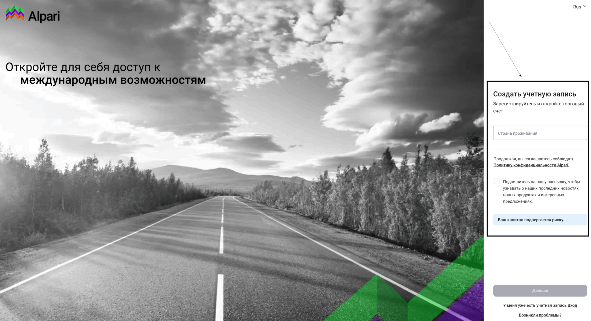 Первое, что нужно сделать — перейти на действующий сайт брокера. Здесь возникает первый практический вопрос: какой именно URL использовать? У Alpari несколько доменов, и это может сбить с толку. Основной международный сайт — alpari.com. Существует также alpariforex.org и ряд региональных версий. Для российских трейдеров актуален именно alpari.com/ru/ — русскоязычная версия международного сайта. Не путайте его с alpari-broker.ru — это сайт отдельного российского юрлица «Альпари-Брокер», работающего на фондовом рынке через QUIK (об этом различии мы подробно говорили в предыдущем разделе).