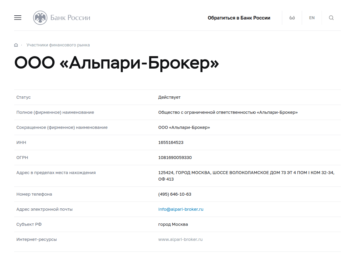 ООО «Альпари-Брокер» — российское юрлицо с лицензиями ЦБ РФ на фондовый рынок