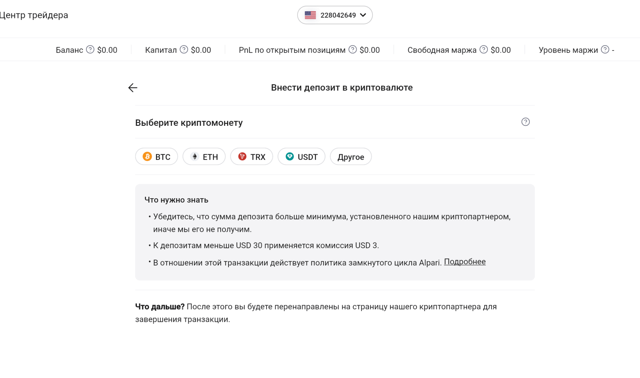 - Криптовалюты — BTC, ETH, USDT и ряд других. Пополнение криптовалютой стало одним из наиболее популярных способов для российских трейдеров после 2022 года, поскольку оно не зависит от банковской инфраструктуры и санкционных ограничений. Комиссия сети оплачивается отправителем, Alpari заявляет об отсутствии комиссии за зачисление.