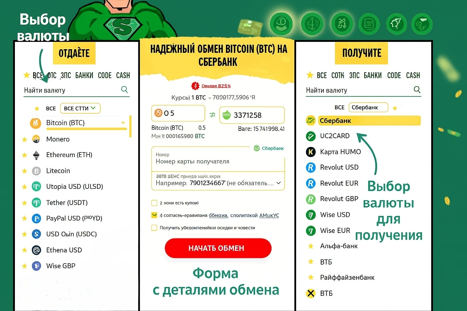 Слева — валюта, которую вы отдаете (например, Сбер, Payeer, Bitcoin).