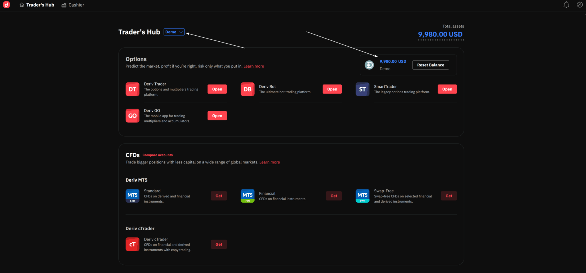 После завершения этих шагов вы попадаете в Traders Hub — центральную панель управления аккаунтом. Здесь автоматически доступен демо-счёт с виртуальными средствами ($10 000), которые можно пополнять неограниченное количество раз. Демо-счёт позволяет протестировать все основные платформы Deriv — DTrader, SmartTrader, DBot — и попробовать различные типы контрактов: Rise/Fall, Higher/Lower, Touch/No Touch и другие. Также из Traders Hub можно создать демо-аккаунты для Deriv MT5, причём доступны три категории: Derived (синтетические индексы), Financial (валюты, акции, индексы) и Swap-free (бессвоповые).