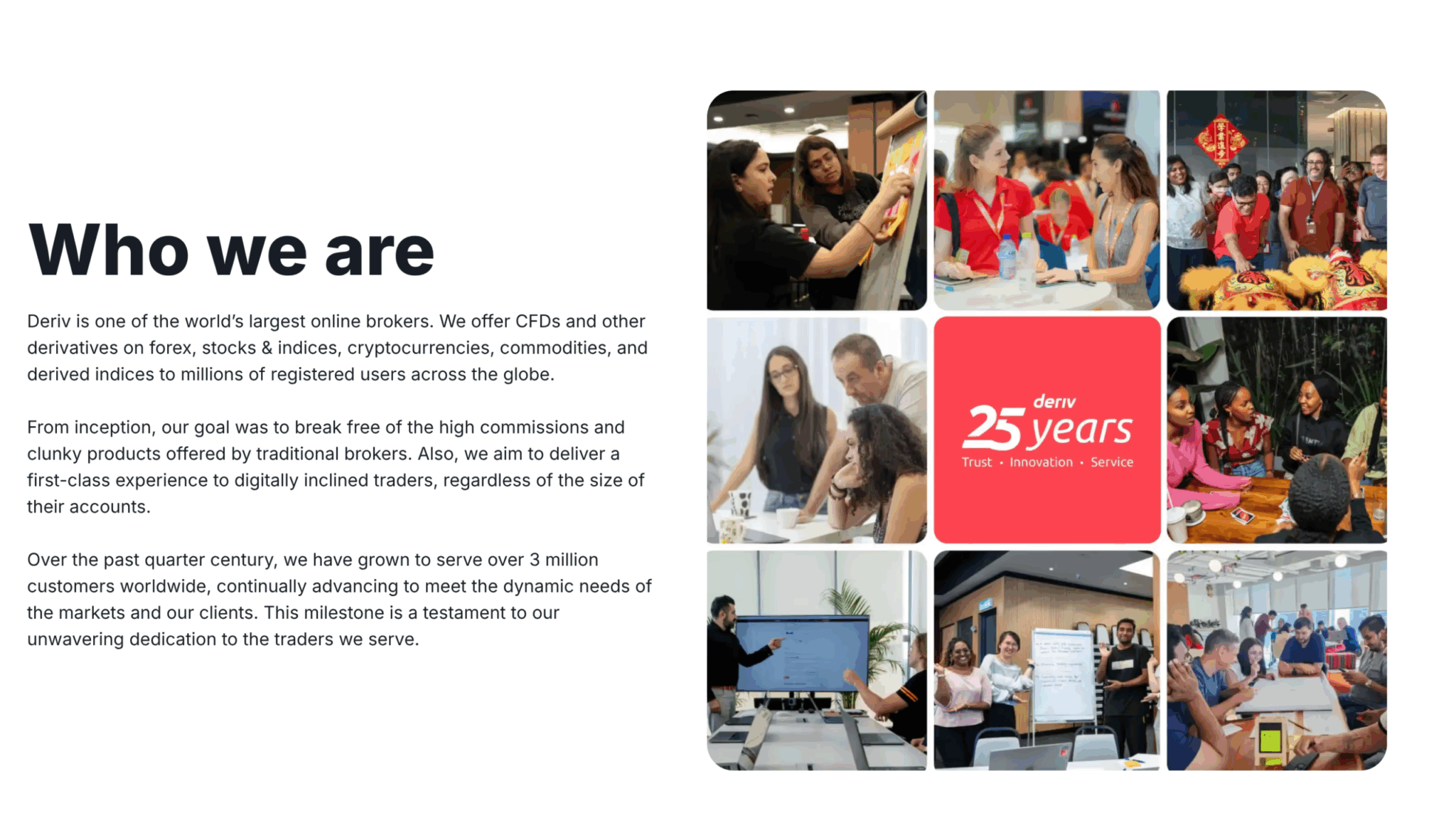 К 2025–2026 годам Deriv вырос в по-настоящему крупного игрока: более 3 миллионов клиентов по всему миру, ежемесячный объём торгов свыше $650 миллиардов, более 168 миллионов сделок в месяц и ежемесячные выплаты клиентам, превышающие $46 миллионов. Компания получила множество отраслевых наград, включая «Broker of the Year — Global» от Finance Magnates (2024), «Most Trusted Broker» от UF Awards (2024 и 2025), «Best CFD Broker LATAM» и «Most Innovative Broker MEA» от UF Awards (2025).