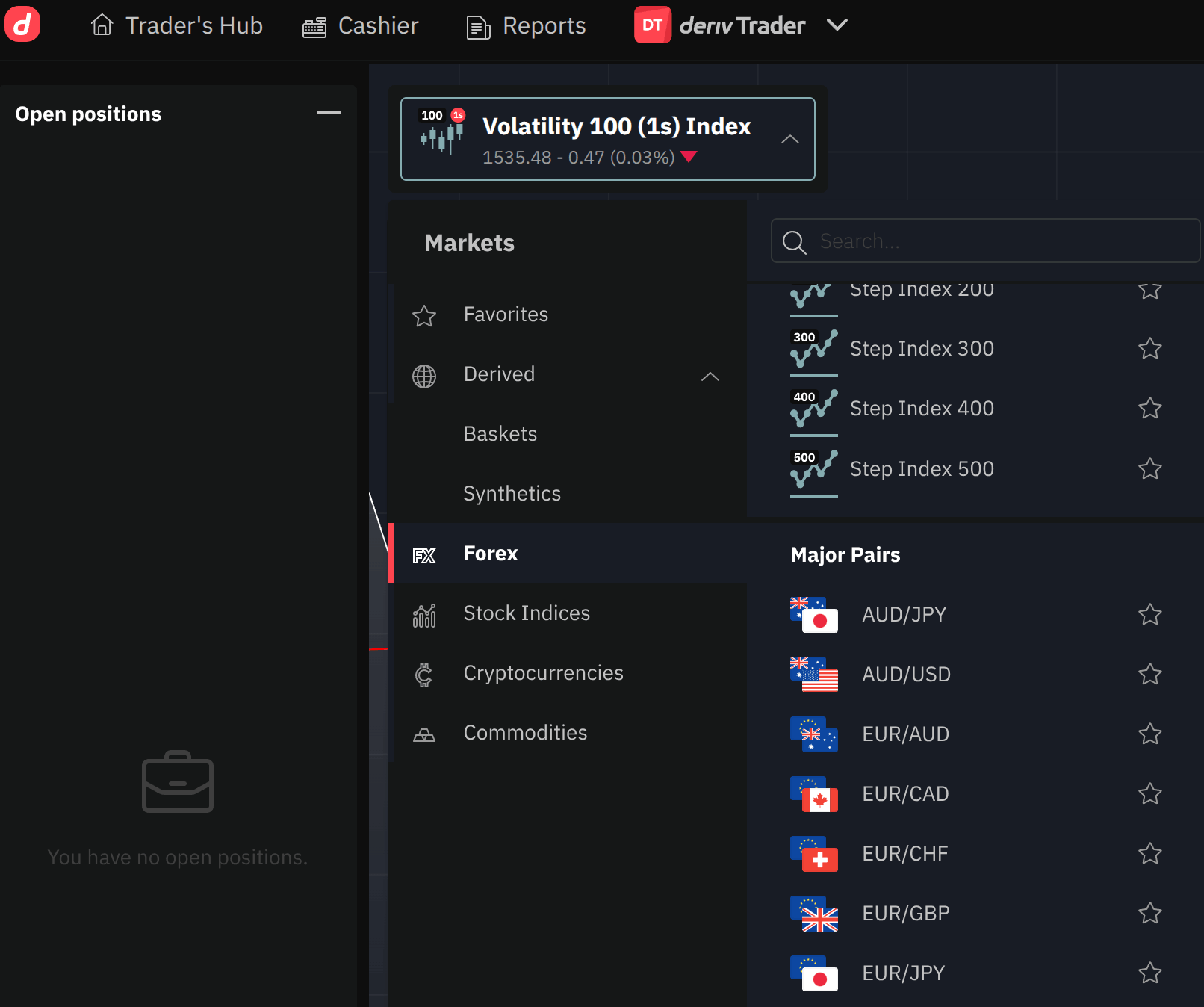 В разделе CFDs (Contracts for Difference) Traders Hub отображает доступные варианты: