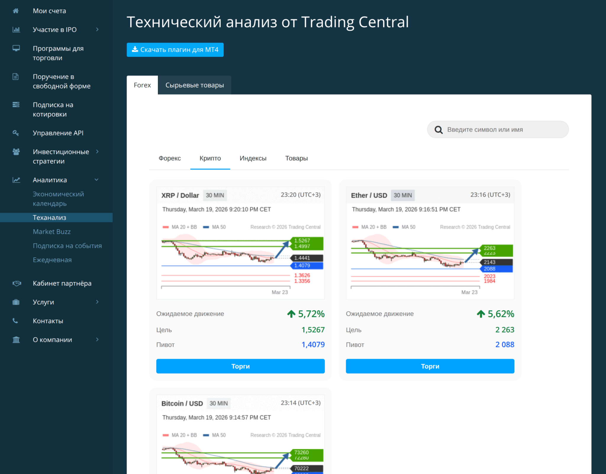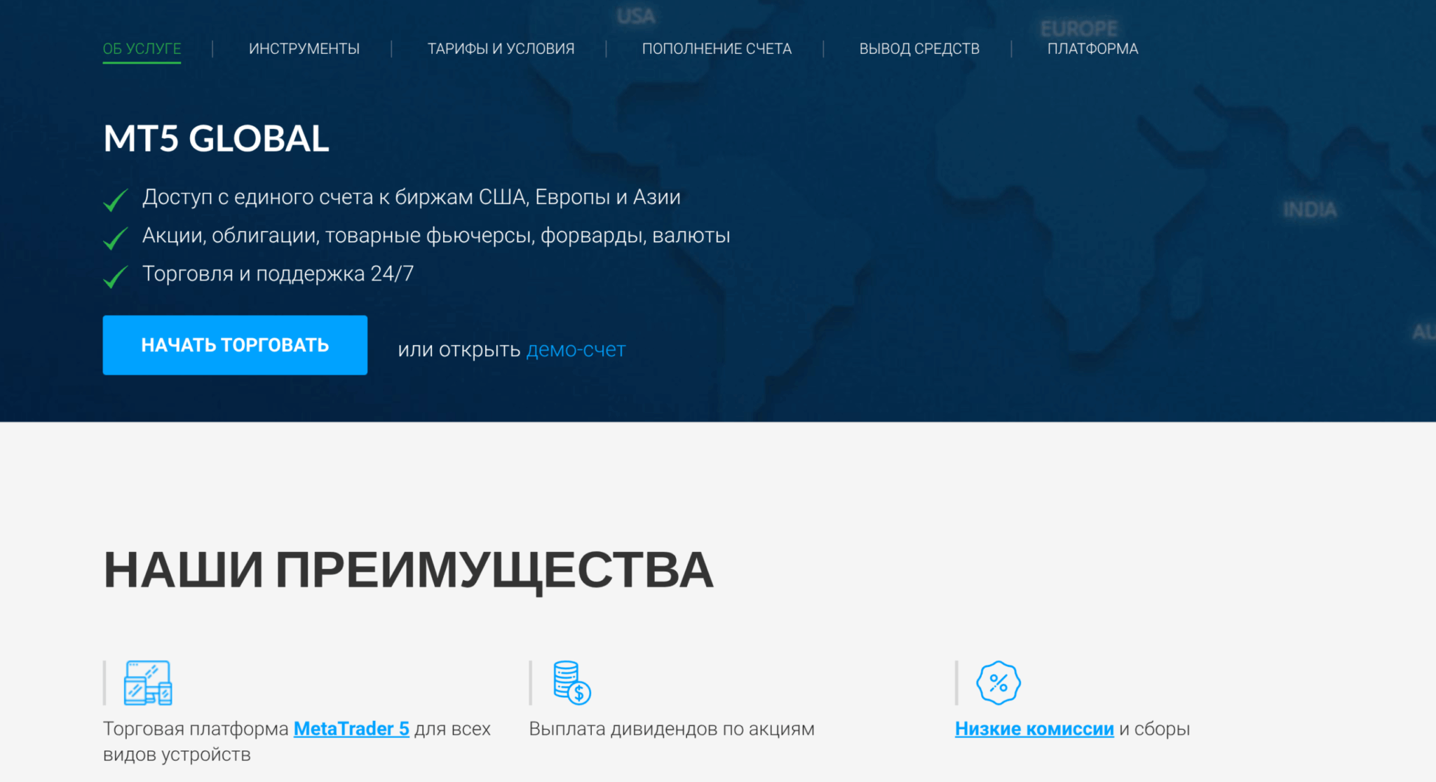 Минимальный депозит — $100, спреды по форексу от 0.0 пункта, комиссия — $2 за лот по валютным парам. По акциям и другим биржевым инструментам комиссии зависят от конкретной биржи и типа актива (подробнее — в разделе о тарифах). Платформа — MetaTrader 5, более современная и функциональная версия MT4 с поддержкой стакана цен (Level II), встроенным экономическим календарём и возможностью одновременной торговли на разных рынках.