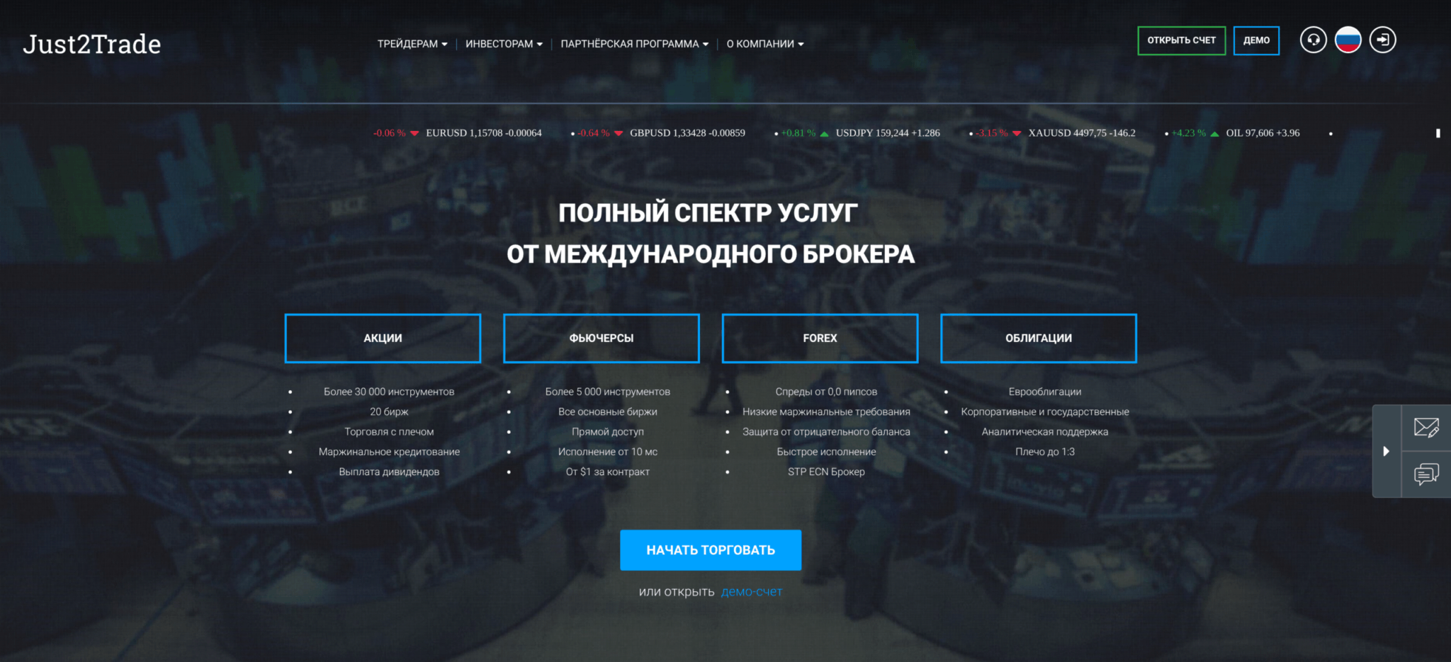 Для форекс-трейдера из России набор инструментов вполне стандартный. В отличие от лицензированных ЦБ РФ форекс-дилеров, у которых список часто ограничен 20–30 парами, Just2Trade предлагает полноценное покрытие, включая пары с рублём (USD/RUB). Контракт на 1 лот равен 100 000 единиц базовой валюты, минимальный размер сделки — 0.01 лота (микролот, $1 000 номинала).