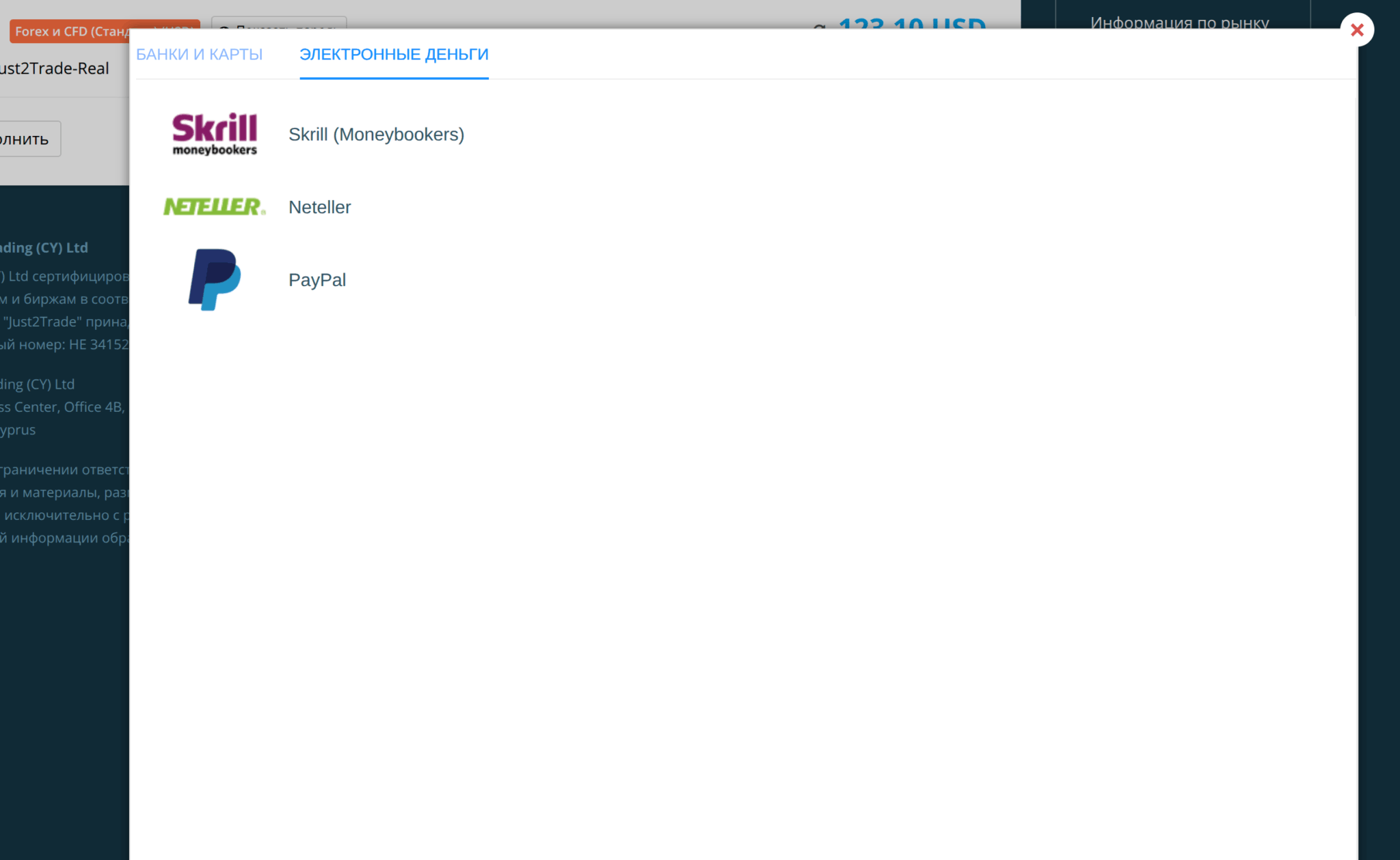 Skrill, Neteller и PayPal — три платёжные системы, доступные для пополнения и вывода в Just2Trade. В личном кабинете они находятся во вкладке «Электронные деньги».