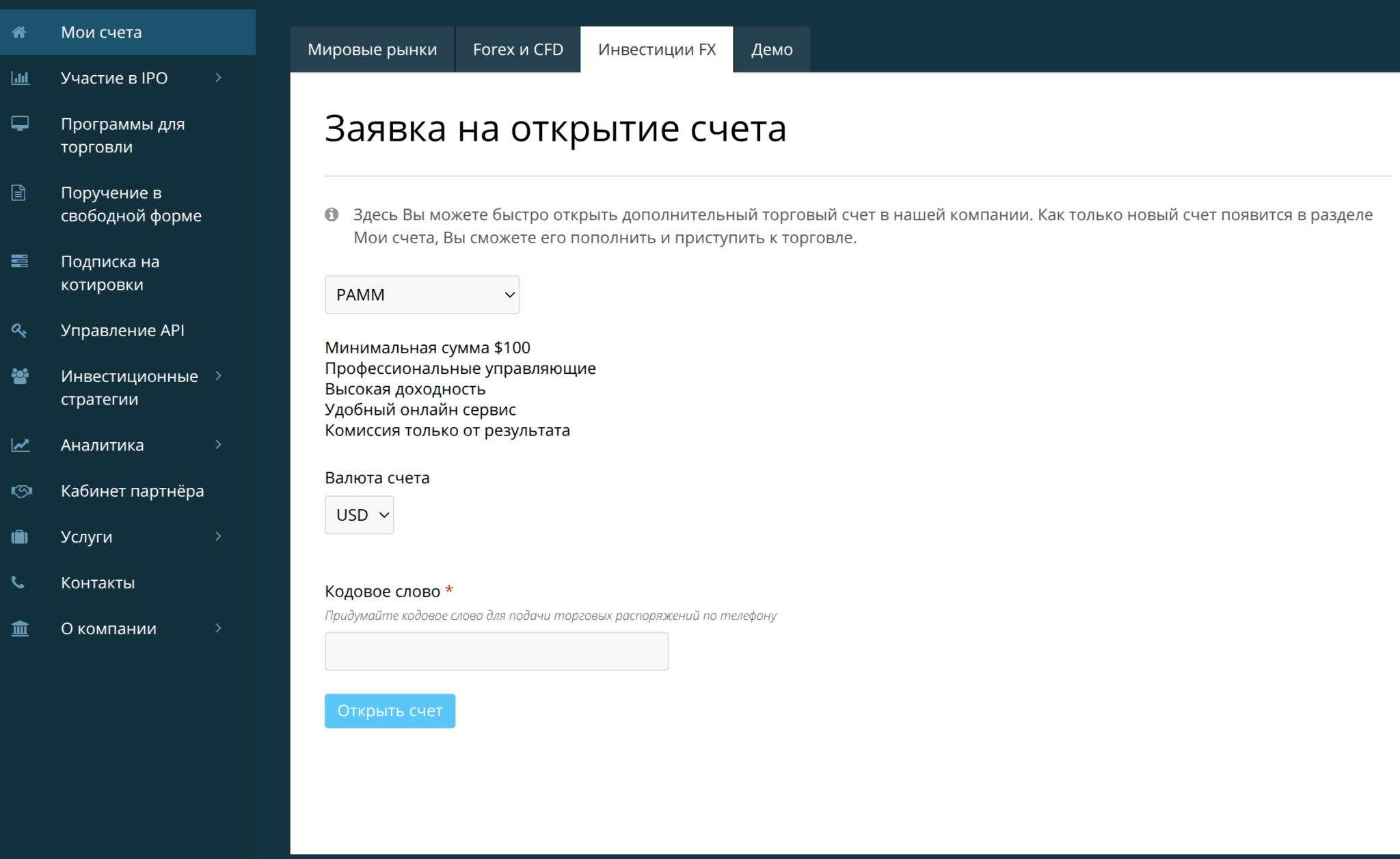 | Форекс | ✅ 50 пар, плечо 1:500 | ✅ | ❌ | ✅ (плечо 1:50) |