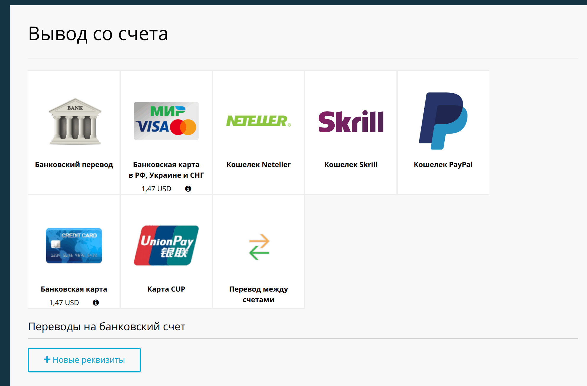 Для вывода средств в личном кабинете Just2Trade предусмотрены два варианта работы с картами. Первый — стандартный вывод на международную карту (Visa/Mastercard), комиссия 1.47 USD. Второй — «Банковская карта в РФ, Украине и СНГ» с поддержкой карт МИР, также с комиссией 1.47 USD. Именно второй вариант делает Just2Trade одним из немногих зарубежных брокеров, через которых можно вывести деньги напрямую на российскую карту.