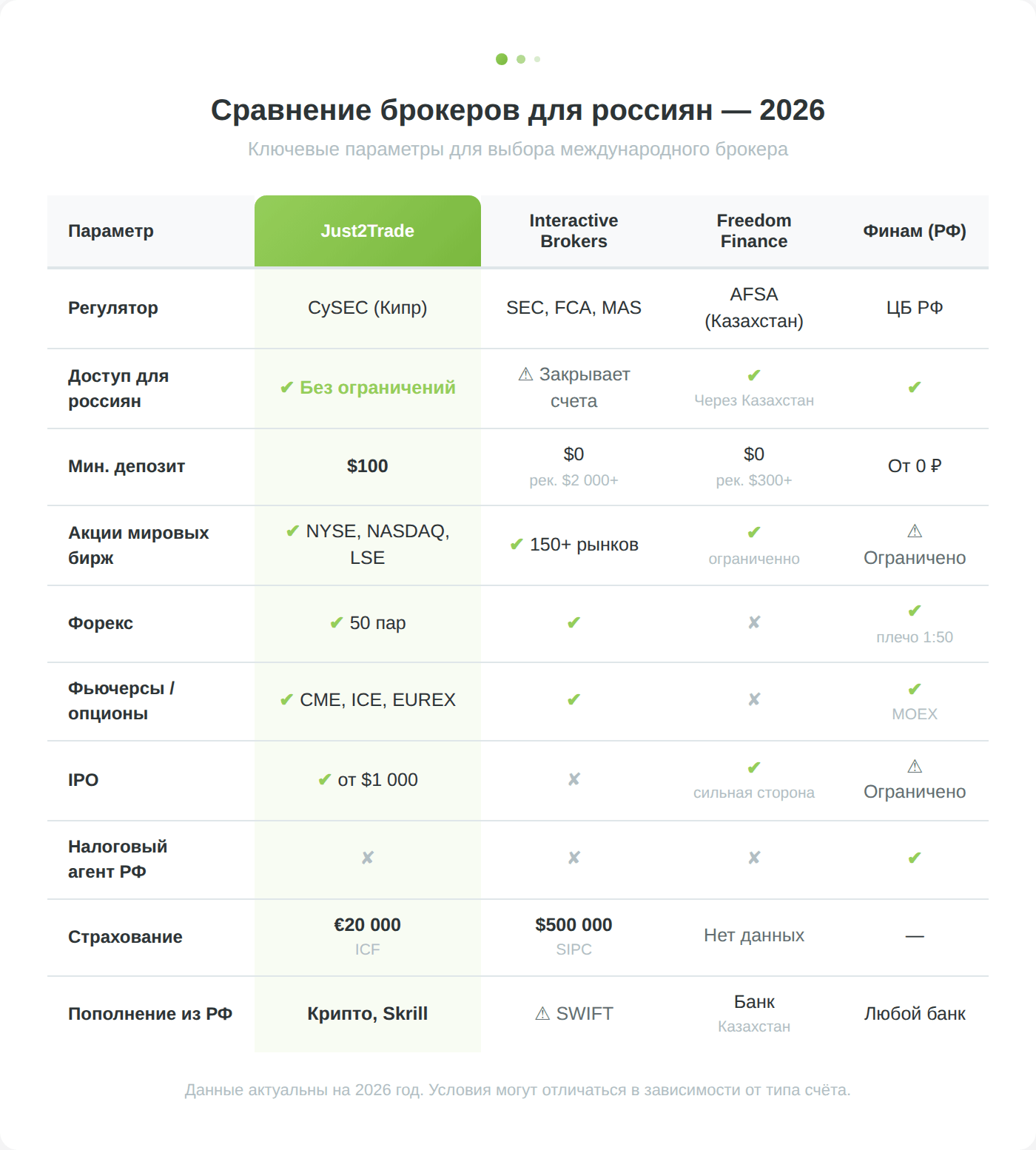| Параметр | Just2Trade | Interactive Brokers | Freedom Finance Global | Финам (РФ) |
