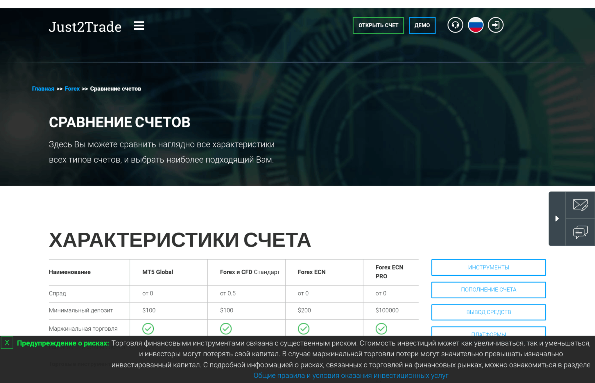 Сравнительная таблица типов счетов Just2Trade: