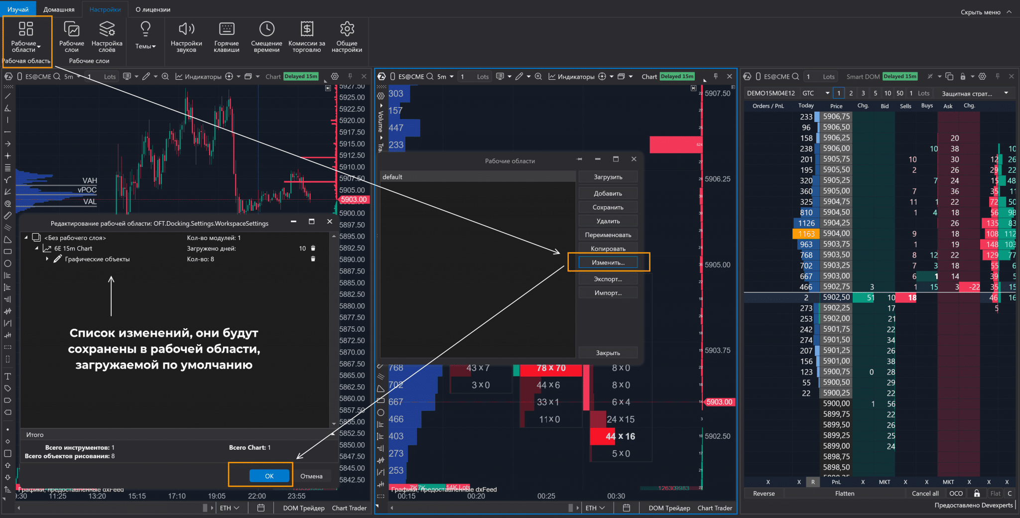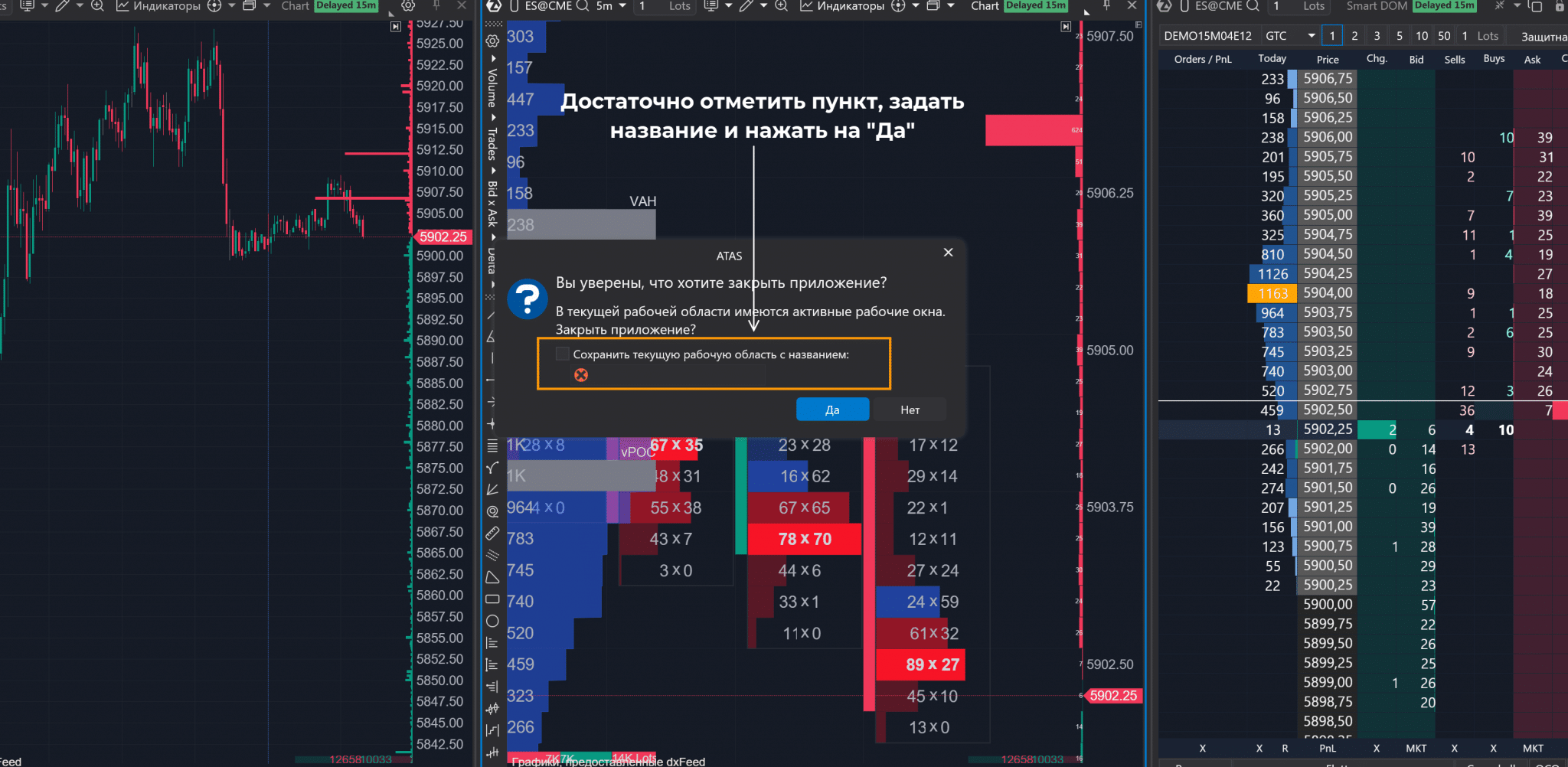 Если сохранение еще не выполнено, то при попытке закрыть торговый терминал ATAS даст возможность сохранить рабочее пространство. Нужно отметить пункт «Сохранить текущую рабочую область», задать название и нажать на «Да».