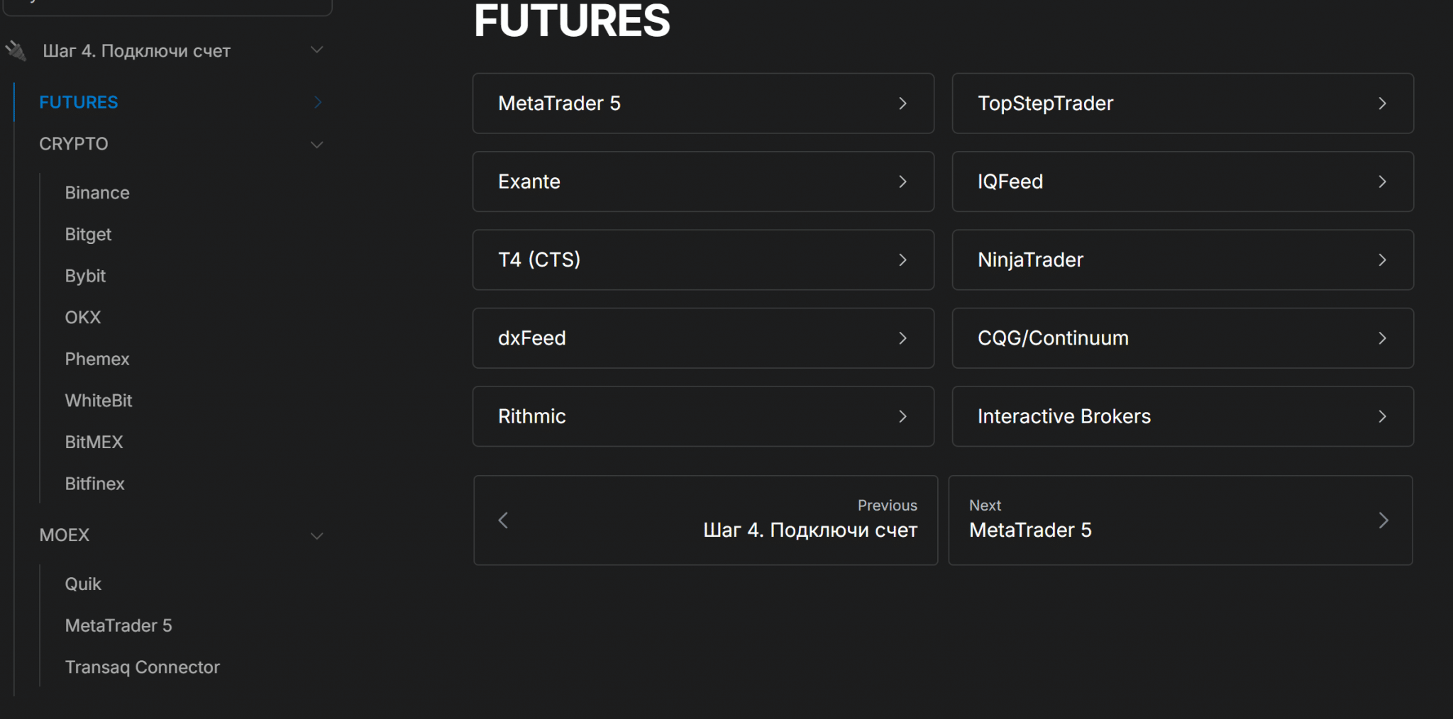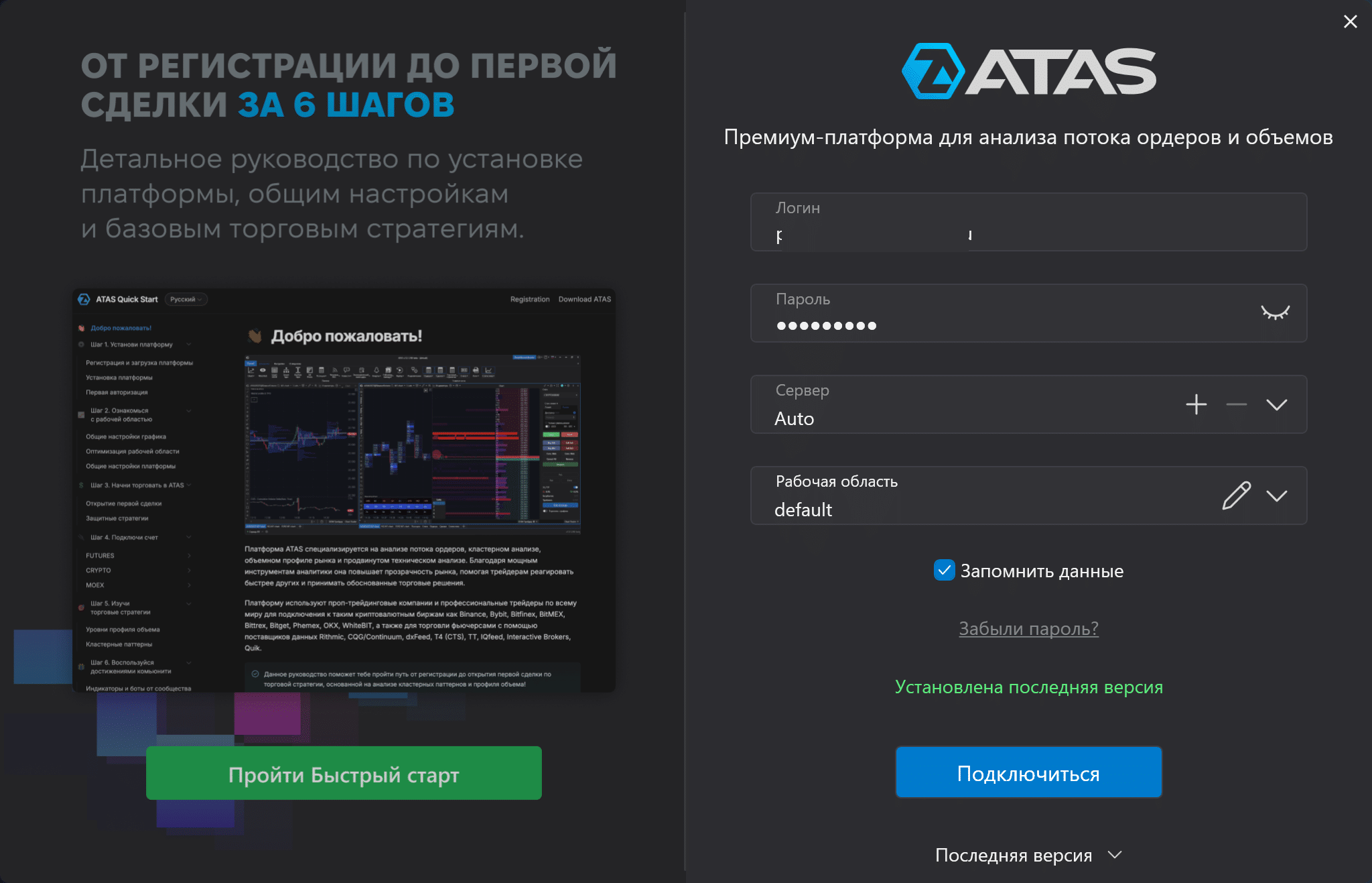 Алгоритм подключения зависит от конкретного рынка, криптобиржи, брокера. На сайте ATAS есть пошаговые инструкции для каждого сценария. Для удобства они разделены на блоки CRYPTO, FUTURES, MOEX.