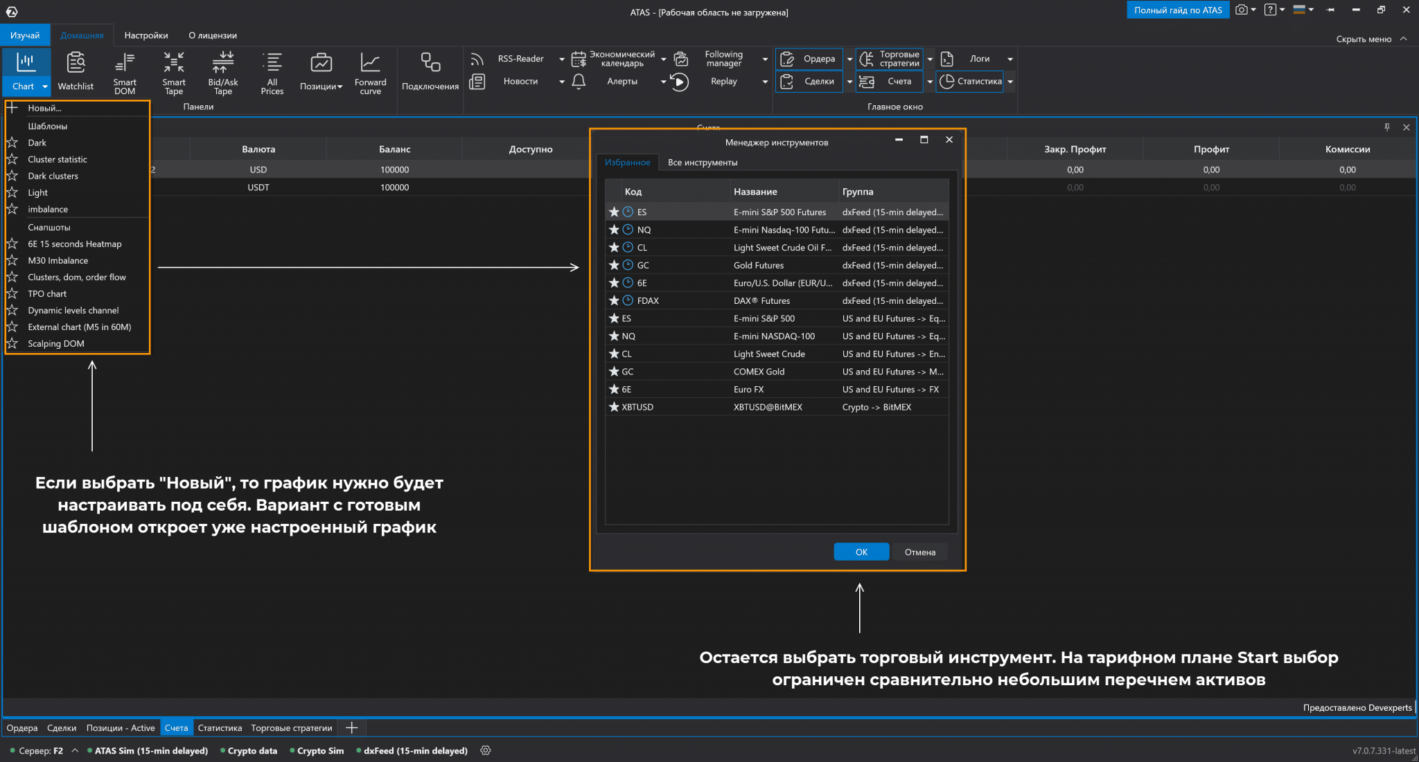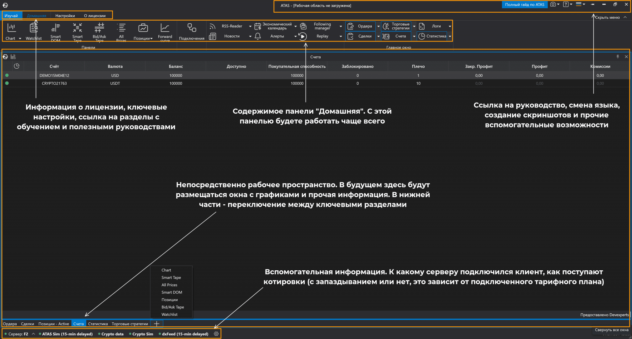 ATAS – это просто платформа, для торговли нужно иметь брокерский счет и подключиться к нему. Поддерживаются все популярные криптобиржи, также есть возможность подключать Quik, МТ5, Transaq Connector счета.