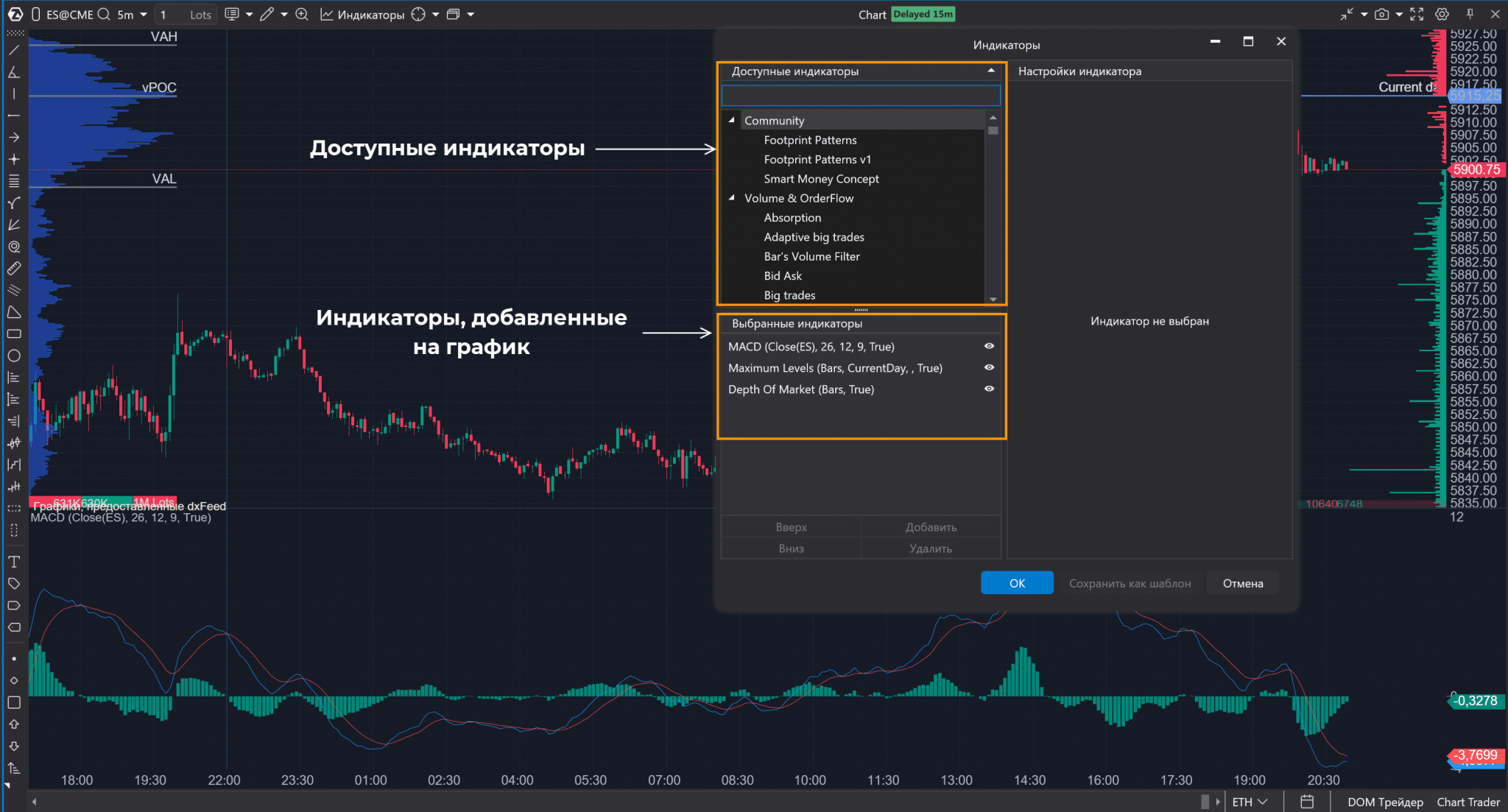 6. Добавлять индикаторы. В платформе есть 240+ индикаторов, их намного больше по сравнению с МТ4 или МТ5. Все стандартно – для добавления выбирается нужный (для удобства есть поисковая строка), в нижней части окна отображаются уже добавленные индикаторы.