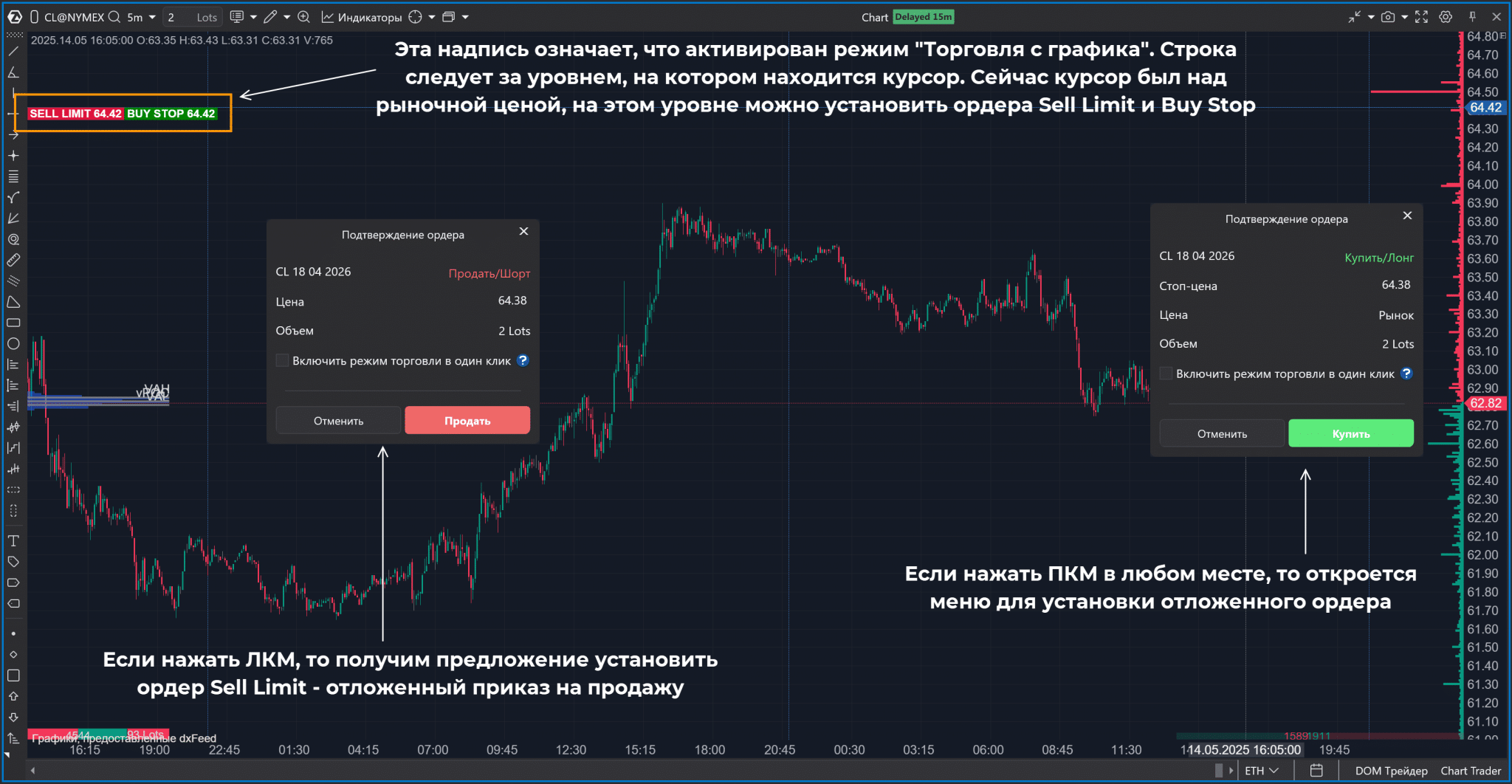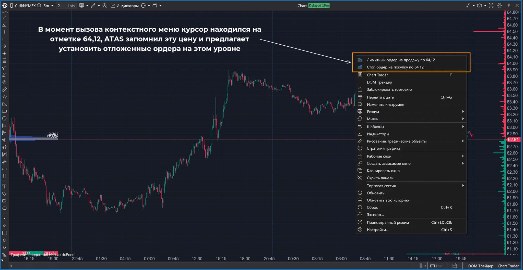 Если в Chart Trader активировать пункт «Торговля с графика», то можно будет устанавливать ордера, нажимая на ЛКМ/ПКМ над или под рыночной ценой. Пока курсор над рыночной ценой: