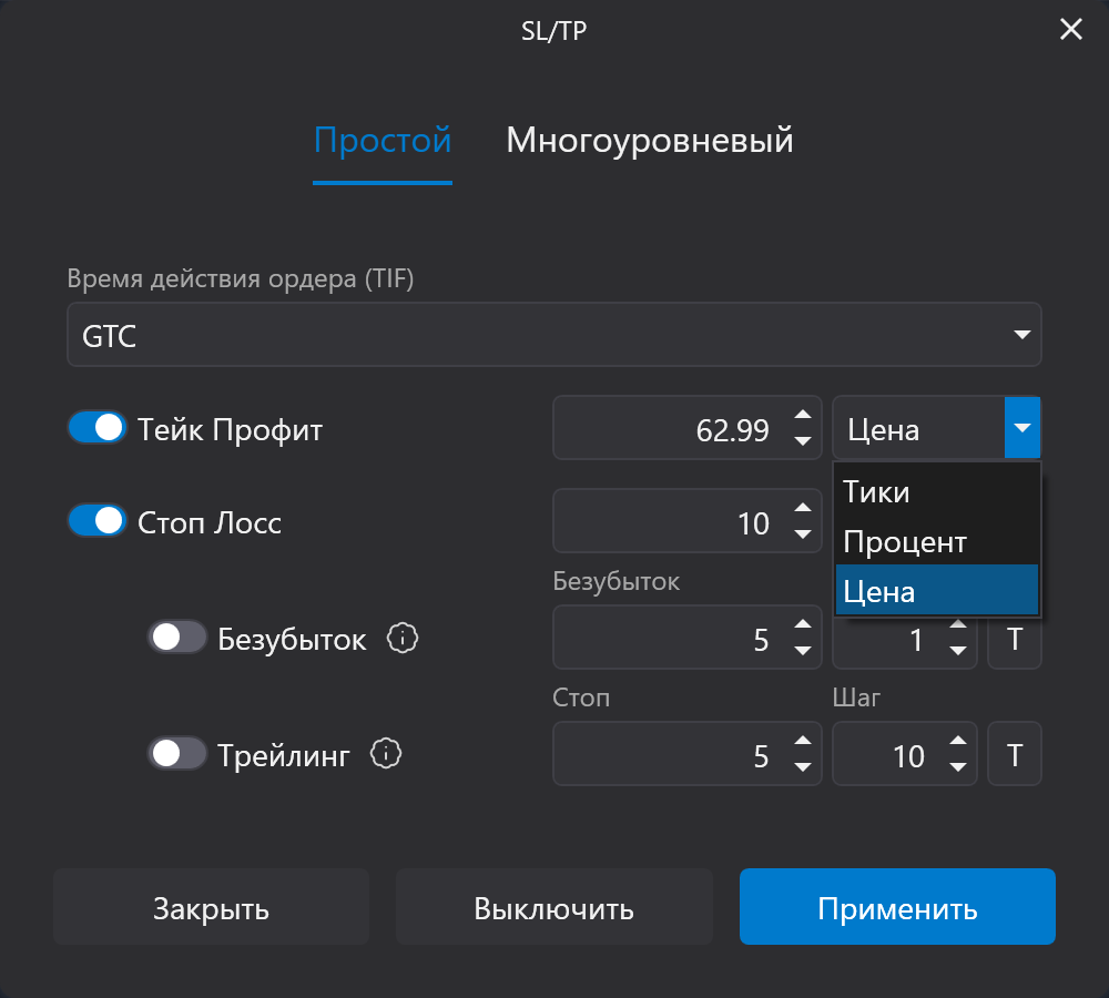 1. Простой. ТР и SL можно задавать в тиках, процентах или указать конкретный ценовой уровень. Здесь же можно активировать перевод в безубыток и трейлинг-стоп. Здесь же можно изменять тип ордера (Day, FOK, GTC).