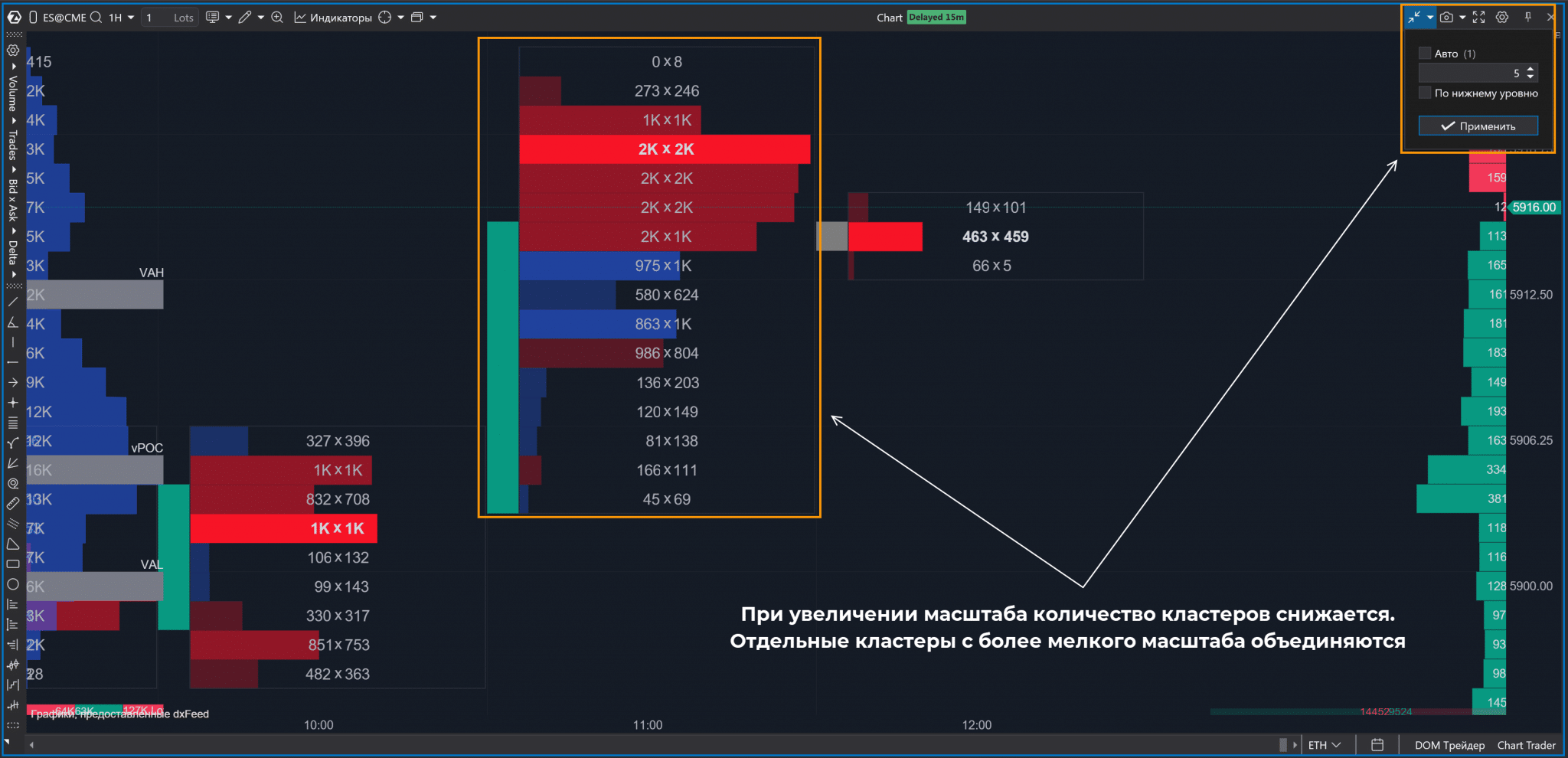 2. На уже открытом обычном графике использовать сочетание Shift + k. Автоматически изменится масштаб и появятся кластеры.