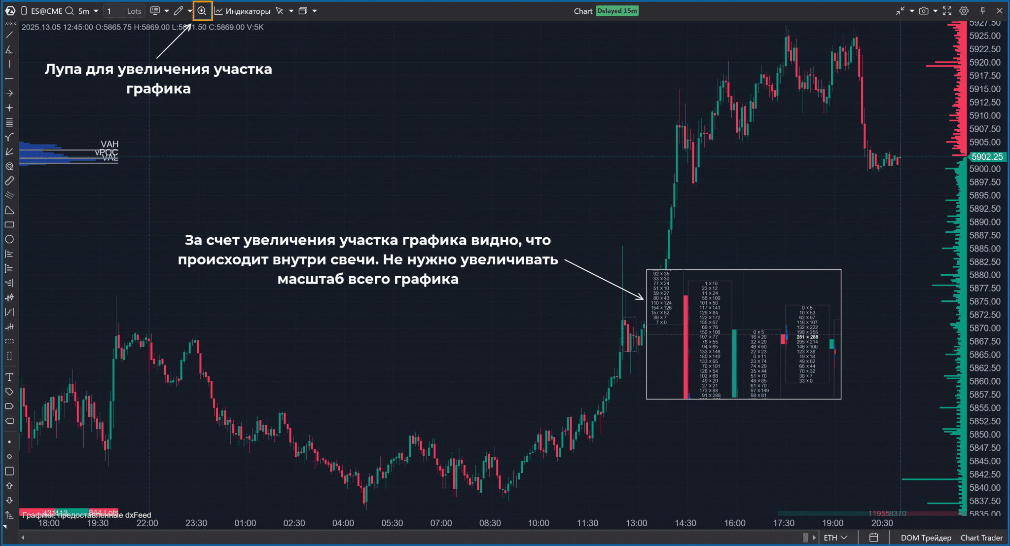 7. Рассматривать участок графика «под лупой». Этот инструмент вызывается нажатием кнопки «М», также его можно выбрать на панели инструментов. Если с активной лупой подвести курсор к участку графика, то во всплывающем окне увидите увеличенный участок графика. Это полезно при кластерном анализе, можно посмотреть, что происходит внутри свечи, не меняя масштаб всего графика.