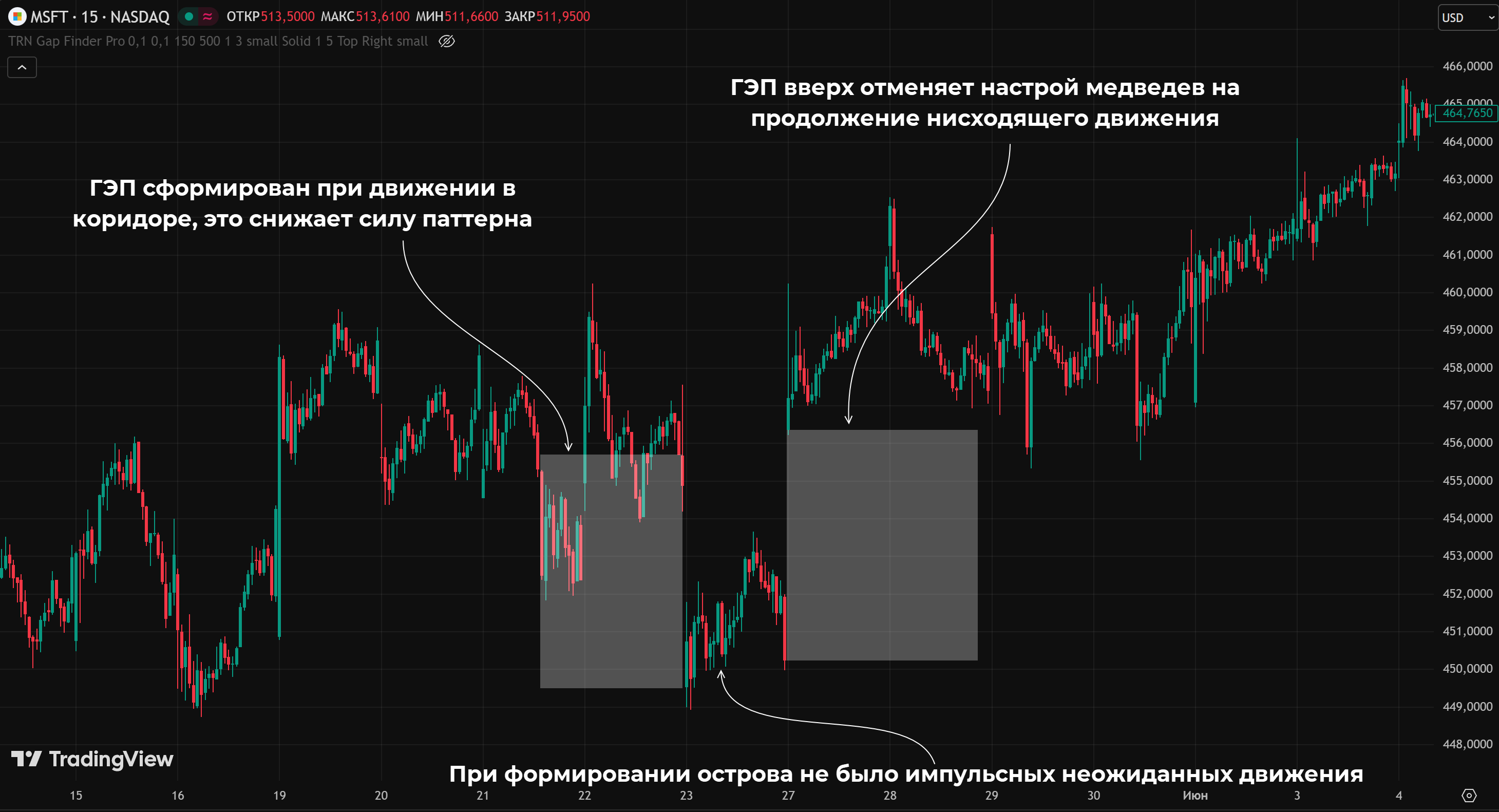 Паттерн получил название за счет того, что группа свечей оторвана от остальных. Слева и справа есть ГЭПы, несколько свечей превращается в «остров», отделенный от остальной части графика.