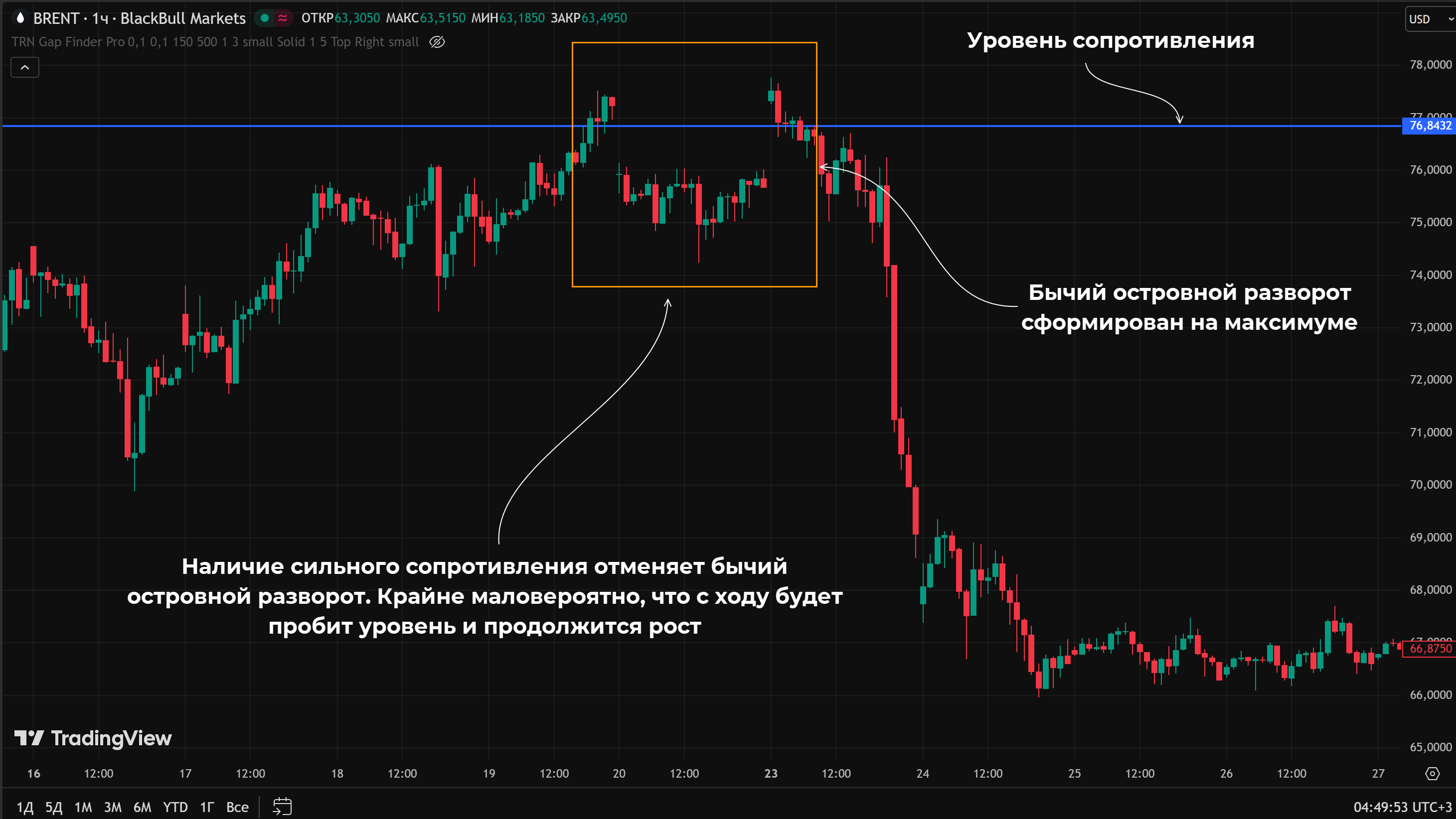 - Область формирования. Паттерн усиливается, если формируется в зоне сильной поддержки/сопротивления. У сопротивления должен формироваться медвежий островной разворот, у поддержки – бычий.