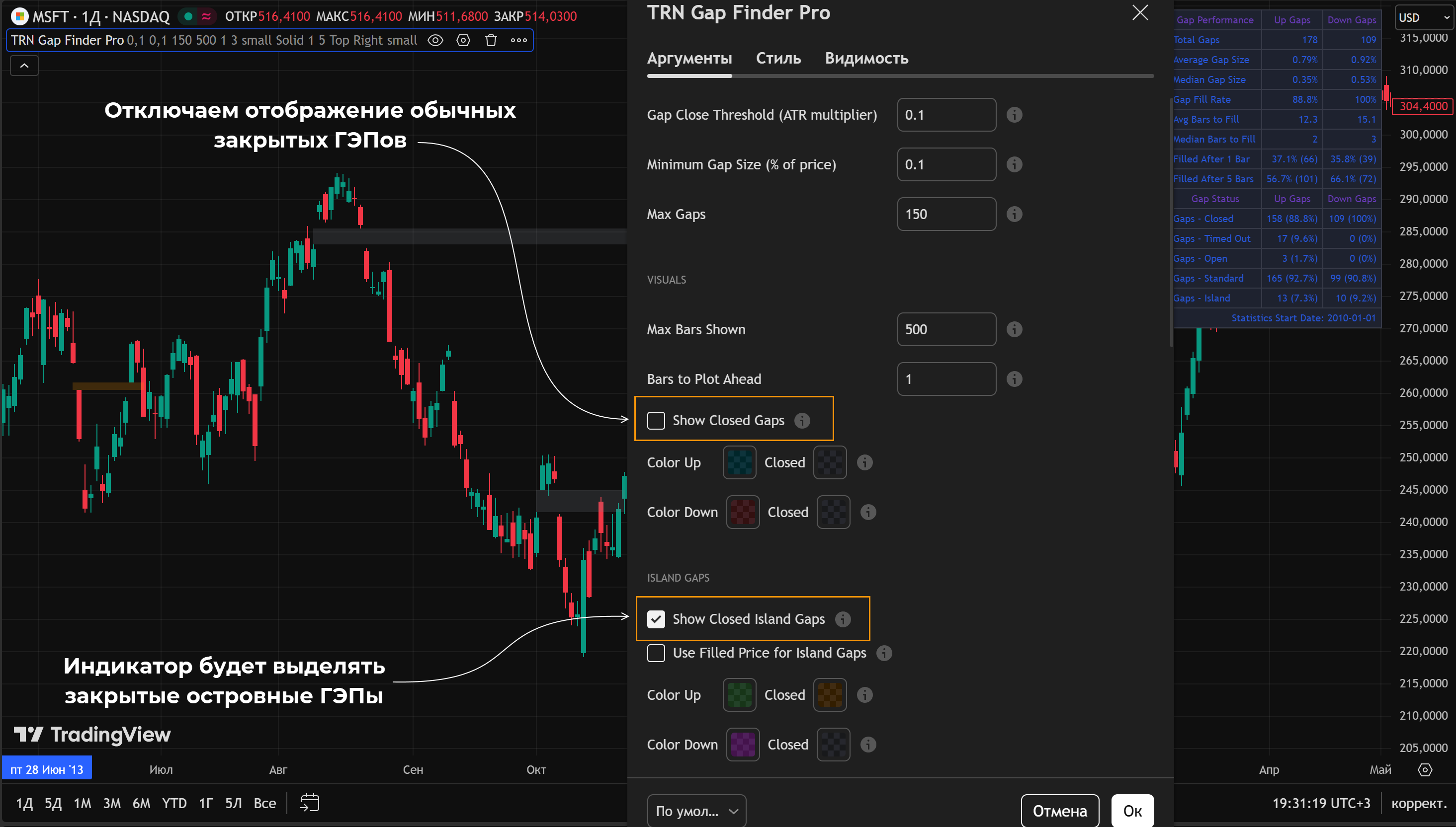 В параметрах нужно активировать пункт «Show Closed Island Gap», пункт «Show Closed Gap» отключается. При таких настройках индикатор выделяет только островные ГЭПы и фактически TRN Gap Finder Pro превращается в инструмент для поиска Island Reversal.