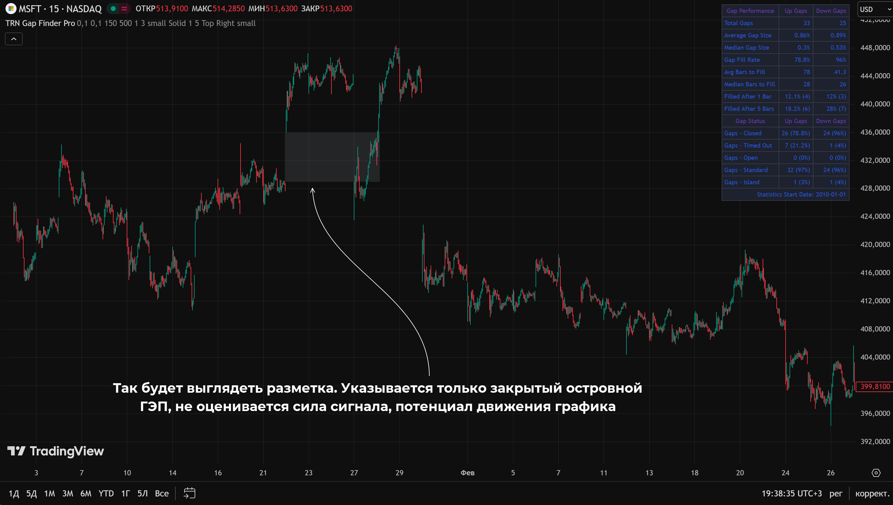 - Появляется ГЭП вверх, модель можно считать завершенной. Возврат в зону «острова» крайне маловероятен, это область, в которой медведи потерпели неудачу, в ней были лишь трейдеры, возлагающие надежды на то, что появится крупный продавец.