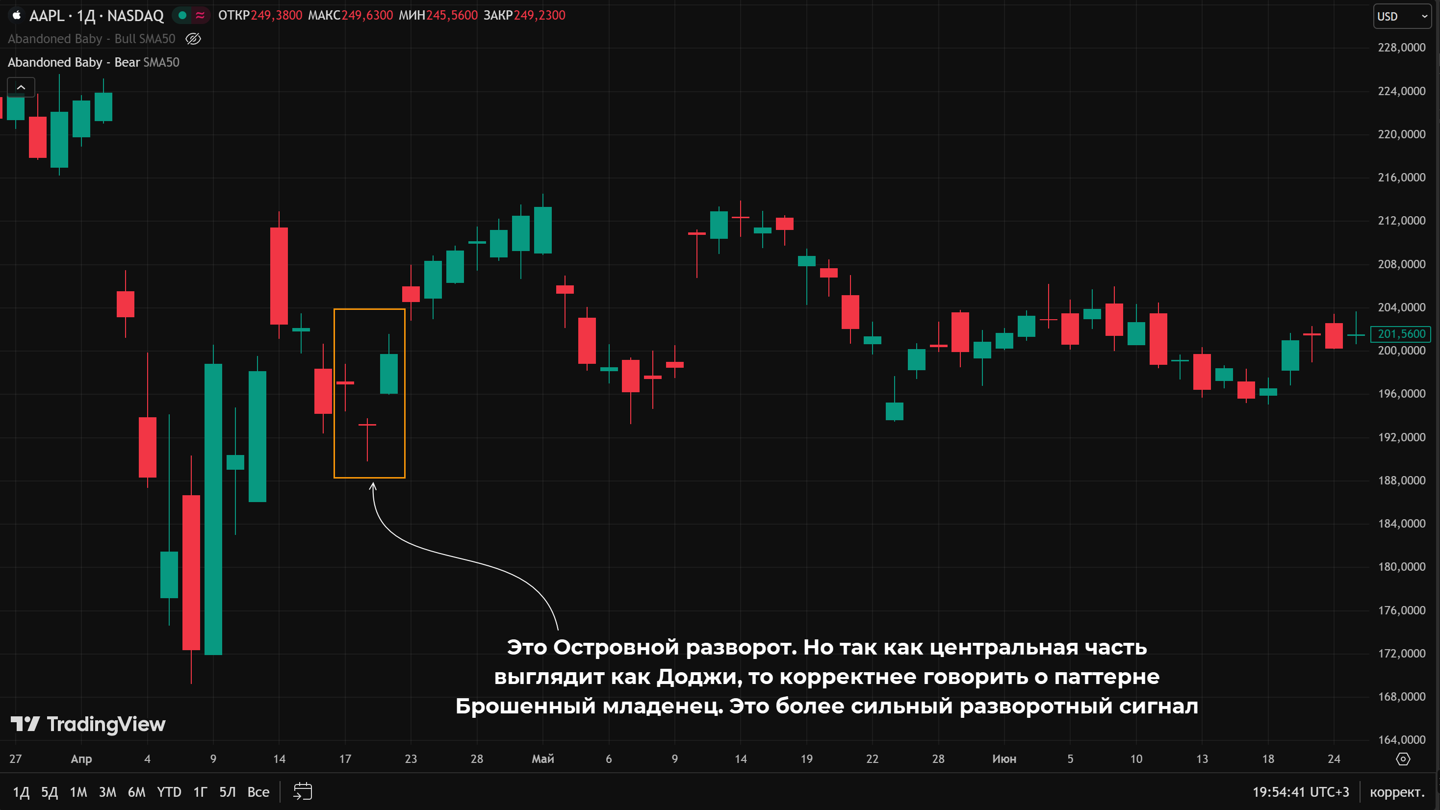 На платформе TradingView есть специальные индикаторы для поиска бычьей и медвежьей версии Брошенного младенца. Так как паттерн редкий его используют как дополнение к основной ТС.