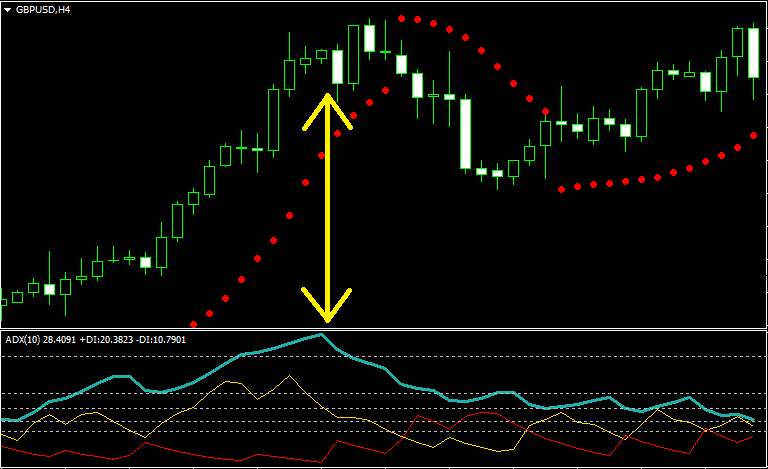 Прекрасным сочетанием можно назвать индикатор Parabolic SAR и индикатор силы тренда ADX. Один показывает тренд, другой – его силу. Как только интенсивность движения падает – ADX сразу просигнализирует снижением значения, и произойдёт это ещё до того, как точки параболика сменят свою сторону. В сочетании с сигналами самого ADX получается достаточно удобно и просто выявлять коррекции и боковики – сила тренда невысокая, а параболик постоянно меняет положение.
