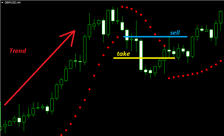 - Точки над графиком свидетельствуют о понижательном движении и рынок в этот момент в медвежьем тренде.