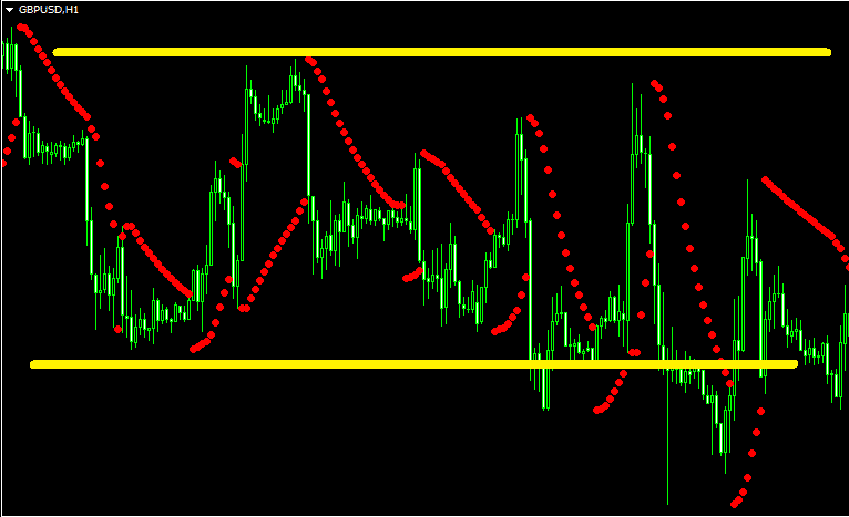 1. Торговля во флэте. Сразу возникает вопрос – а как это возможно, если индикатор относится к трендовым. На самом деле всё довольно просто. Параболик сможет показать нам коррекцию, и если она принимает горизонтальный вид, то мы можем обозначить её границы.