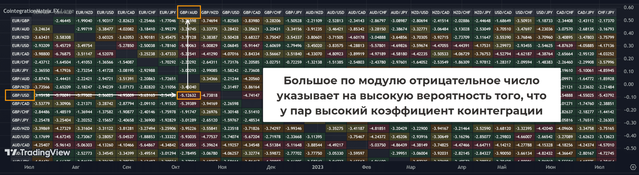 Чем больше по модулю отрицательное число, тем выше вероятность того, что единичного корня нет и активы подходят для парной торговли: