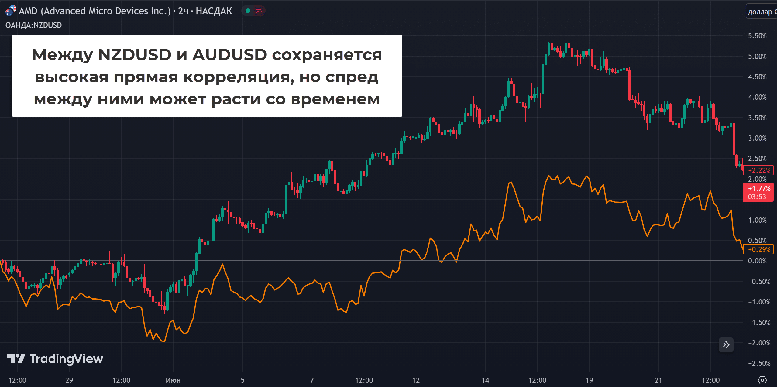 Корреляция означает лишь то, что движение активов чаще всего совпадает. Если растет инструмент А, то и актив В также будет расти (прямая корреляция). Но это не значит, что разница между ценами этих инструментов останется константой. Если сравнить графики активов с высокой прямой корреляцией, то видно, что расхождение в ценах может нарастать со временем.